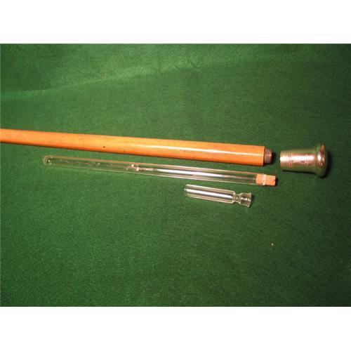 Liquor vial and shot measurewithin blond malacca cane. Silver knob reads on the top 'Presented by Major B.J.D. Gerrard' One side of knob inscribed 'C.Q.M.S. (Quarter -master) T.A. Faulder' The other side badge of the colonial 'Nigeria Regiment (with palm tree)' c.1890