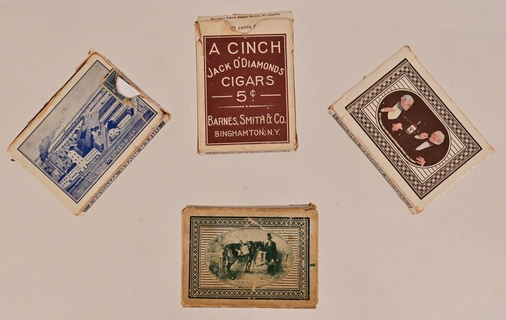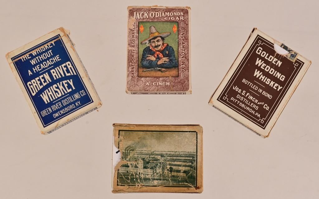 4 Decks of playing Cards Advertising Green River Whiskey (1 Full Deck 1 Deck 45 Cards), Golden Wedding Whiskey (49 Cards) and A CINCH Jack O'Diamonds Cigars (Full Deck).