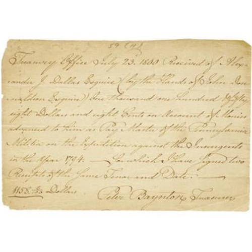 <B> Whiskey Rebellion: Alexander J. Dallas .</B></I> Autograph Document Signed “<I>Peter Baynton, Treasurer,</B></I>” one page, 8” x 5.5”. Treasury Office, July 23, 1800. In full, “<I>Received of Alexander J. Dallas Esquire (by the Hands of John Donaldson, Esquire) One thousand one hundred & fifty eight Dollars and eight Cents on Account of Monies advanced to him as Pay Master of the Pennsylvania Militia on the Expedition against the Insurgents in the Year 1794 - for which I have signed two Receipts of the Same Tenor and Date.</B></I>” In 1791, the national government instituted the first federal excise tax on spirits. This eliminated most of the profits and farmers in western Pennsylvania began attacks on tax agents. These attacks continued until the summer of 1794 when a federal marshal was attacked and the home of a regional inspector was burned. On August 7, 1794, President Washington issued a proclamation, calling out the militia and commanding “all persons, being insurgents…to disperse and retire peaceably to their respective abodes.” The rebellion was suppressed by an overwhelming army of approximately 13,000. Alexander J. Dallas, Secretary of Pennsylvania from 1791-1801, was Paymaster of the Pennsylvania militia and Paymaster General for the federal forces. Peter Baynton served as Pennsylvania Treasurer from 1797-1801. Slight chipping at left edge. Fine condition. <I>Ex. Henry E. Luhrs Collection.</B></I><BR><BR><BR><b>Shipping:</b> Flat Material, Small (<a target="_blank" href="http://www.heritageauctions.com/common/shipping.php">view shipping information</a>)