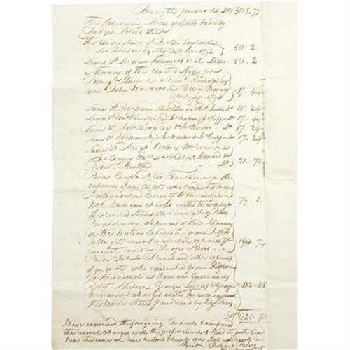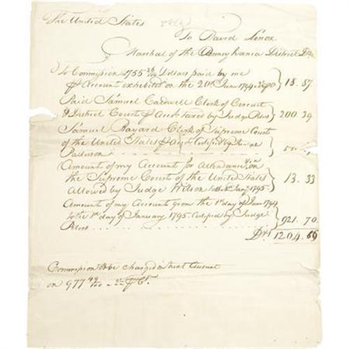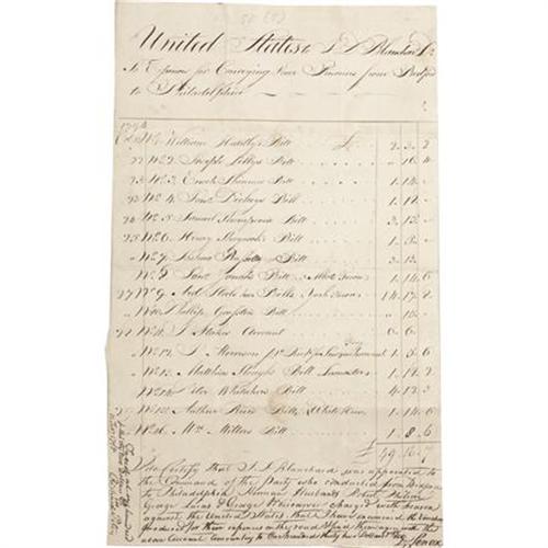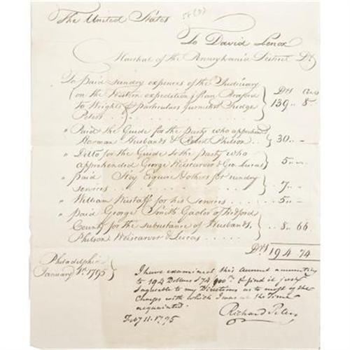 <B>Whiskey Rebellion - An Important Grouping of Documents,</B></I> 4 pieces, 8" x 12" each (approx.), various places, February 11-14, 1795. Includes a lengthy manuscript DS by federal district judge Richard Peters, Jr. (1744-1828) who accompanied the federal forces to western Pennsylvania and who presided over many of the resultant trials, 2 pages, Philadelphia , February 14, 1795, being a copy of a bill to United States from Marshal David Lennox. Lennox was one of the revenue collectors attacked in the summer of 1794, prompting military action against the rebellion. The invoice notes Lennox's expenses from June 1794 to January 1795 including attendance at grand and petit juries, serving summonses and the like. Of particular interest are several entries, amounting to several hundred dollars for paying "<I>Capt. Peter Faulkner for thee expences</B></I> <I>sic</B></I> <I>of an Escort who conducted from Northumberland county to Philadelphia Wm. Bonham charged with treason...paid...by Judge Peters...Paid sundry expences of the Judiciary (on the Western expedition from Bedford to Wright's </B></I> Tavern <I>...Paid Jno. Blanchard for the expences of an Escort who conducted from Bedford to Philadelphia Herman Husbands </B></I> <I>sic</B></I> <I>, Robert Philson, George Lucas & George Wiscarver..." </B></I>Herman Husband (1724-95), a long-time radical and a celebrated North Carolina Regulator, was by the 1780s known as "The Philosopher of the Allegheny," the author of numerous political pamphlets. Around the same period he moved to western Pennsylvania and in the early 1790s became very much part of the resistance against the excise on whiskey, though he argued against violent resistance. Despite his moderation, he too was arrested in 1794 and marched to Philadelphia. Though released, his health was compromised by the long journey and imprisonment, and he died on his return home in June 1795. Peters signs the document attesting to the accuracy of Lennox's claims. Three days earlier, Peters endorsed another bill from Lennox, manuscript document, 1 page, 8.5" x 10.5", Philadelphia, January 1, 1795, this one including monies "<I>Paid the Guide for the party who apprehended Harmon Husbands & Robert Philson...Ditto for the Guide to the party who apprehended George Weiscarver & Geo. Lucas...paid George Smith Gaoler of Bedford County for the substance of Husbands' Philson Weiscarver & Lucas...</B></I>" Offered together with two related documents, one endorsed and signed by David Lennox "<I>David Lenox</B></I>", 1 page, 8" x 13", no place February 12, 1795 certifying that "<I>...J. D. Blanchard was appointed to the Command of the Party who conducted from Bedford to Philadelphia...charged with Treason against the United States...</B></I>" Light toning, a few marginal tears, usual folds, else very good. <I>Ex. Henry E. Luhrs Collection.</B></I><BR><BR><BR><b>Shipping:</b> Flat Material, Small (<a target="_blank" href="http://www.heritageauctions.com/common/shipping.php">view shipping information</a>)