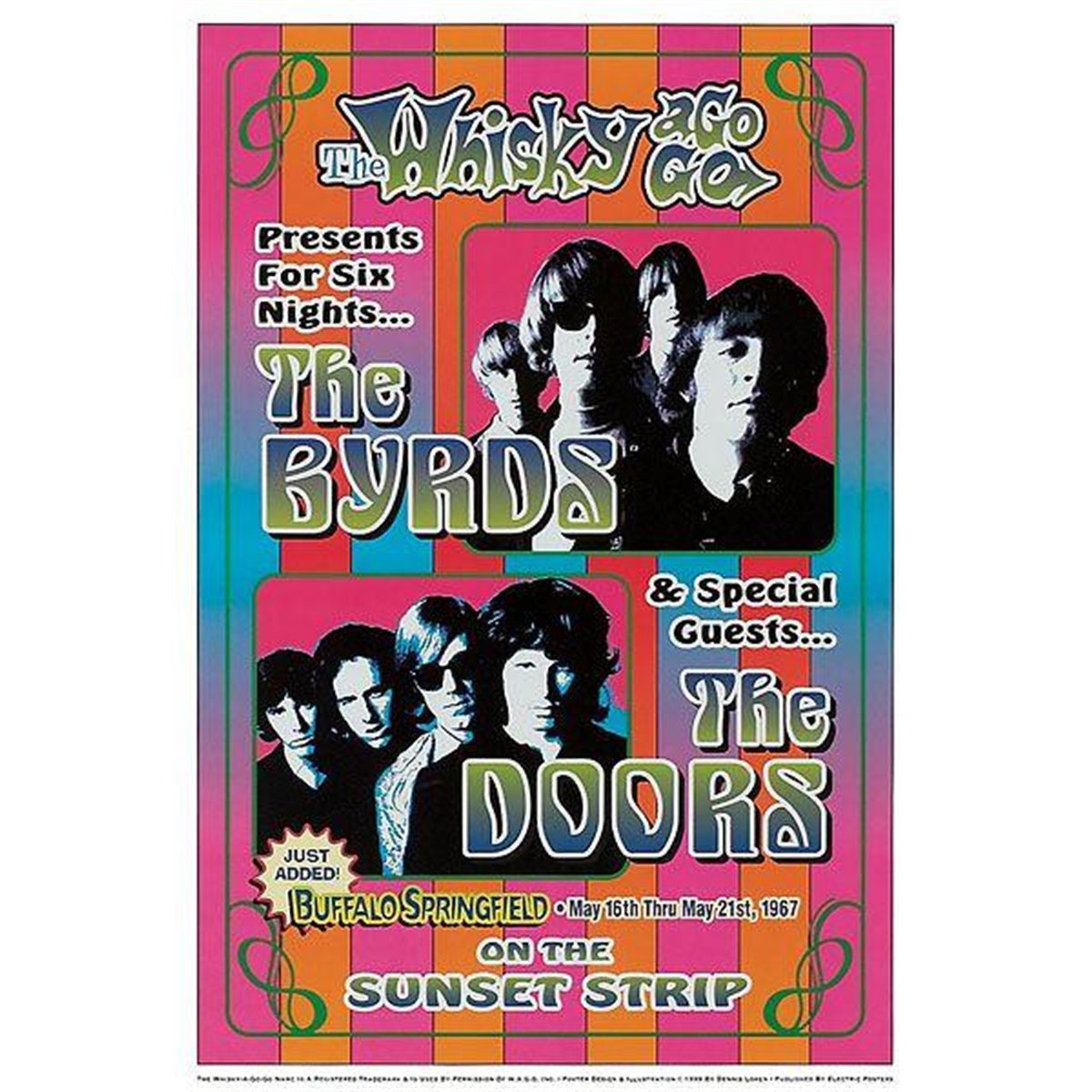 This is a reproduction poster from an amazing triple bill concert that took place in 1967 at the legendary Whisky-A-Go-Go in Los Angeles. The Byrds headlined the show, while the Doors, yet to break out with a hit, were the openers. There is also a just added rock band, Buffalo Springfield. Medium: Poster on paper * Framing: In box frame with black edgesSize: 18 1/2 x 12 1/4 inches.Condition: New, still shrinkwrapped in original packagingNote: This is a vintage print, not an original