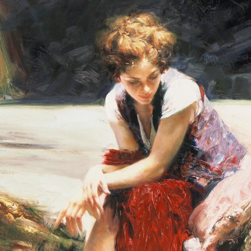 Pino's portraits allow glimpses into intensely personal, intimate spaces, conveying emotion through rich, warm color and sensual brushwork. "Whispering Heart" is a limited edition giclee on stretched canvas that has been hand-embellished by Pino himself, AP numbered and hand signed by Pino (1939-2010). Includes Certificate of Authenticity! Measures approx. 28" x 28" (image).