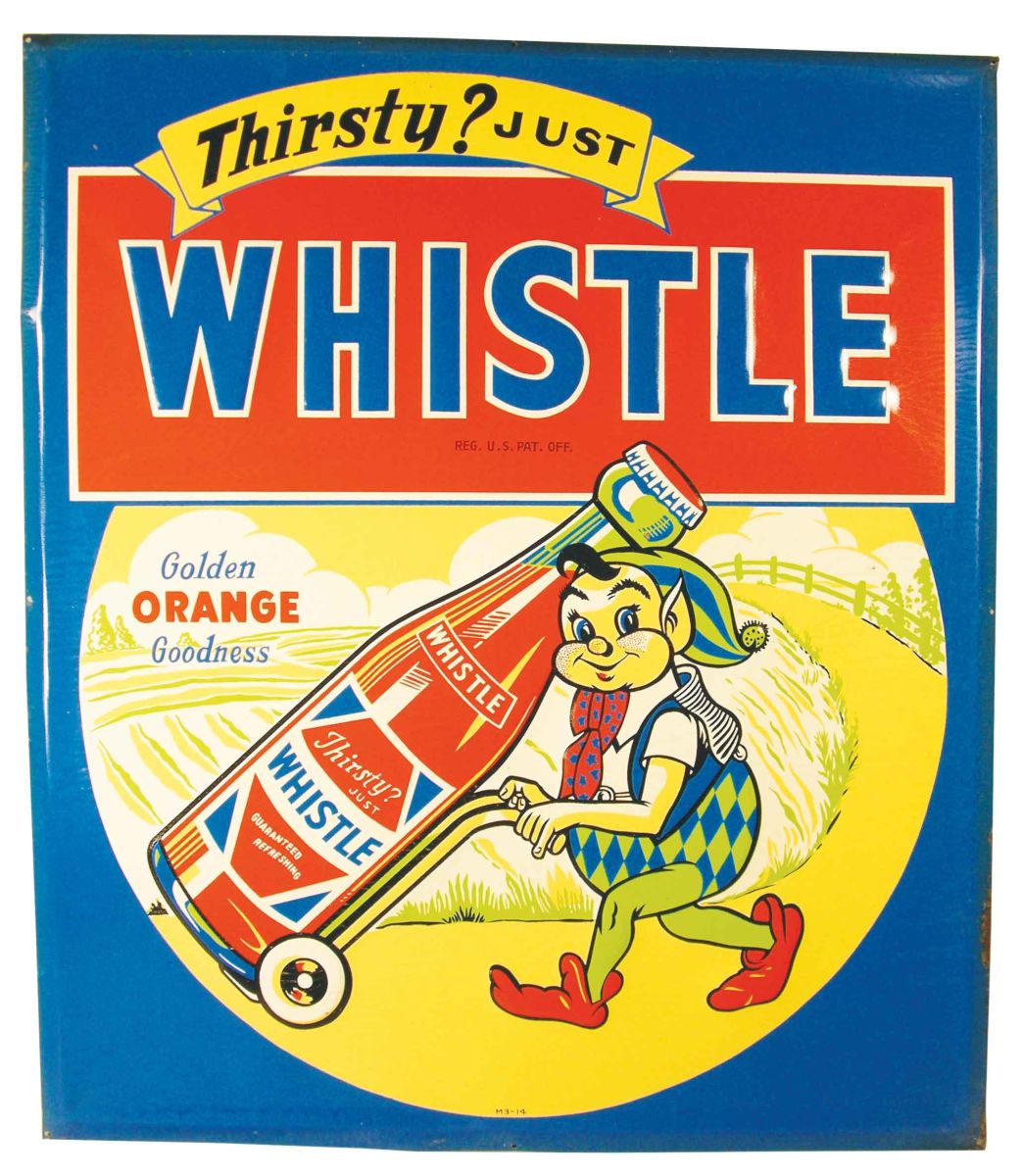 Whistle Beveled Tin Sign. Some paint loss at 4:00 otherwise excellent condition. 26 X 30 inches.