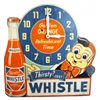 Whistle Soda Advertising Clock. No. WC6-92 Phelps Mfg. Co. Terre Haute, Indiana. Die Cut, hardboard. Crack at bottom left and staining otherwise good condition. 24 X 24 X 2 1/2 inches.