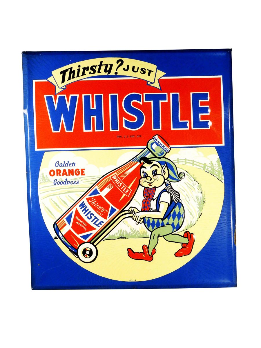 Whistle Soda Embossed Beveled Tin Sign. Some original shipping paper residue throughout otherwise excellent condition. 26 X 30 inches.