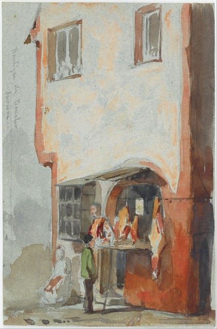 Artist: James Abbott McNeill Whistler - Title: The Butcher Shop - Medium: Fine Art Giclee on Canvas - Image Size: Approximately 20 inches x 13 inches - Framed: Unframed on Unstretched Canvas - Biography: James McNeill Whistler, in full James Abbott McNeill Whistler, (born July 11, 1834, Lowell, Massachusetts, U.S.--died July 17, 1903, London, England), American-born artist noted for his paintings of nocturnal London, for his striking and stylistically advanced full-length portraits, and for his brilliant etchings and lithographs. An articulate theorist about art, he did much to introduce modern French painting into England. His most famous work is Arrangement in Grey and Black No. 1 (1871; also called Portrait of the Artist's Mother or Whistler's Mother).