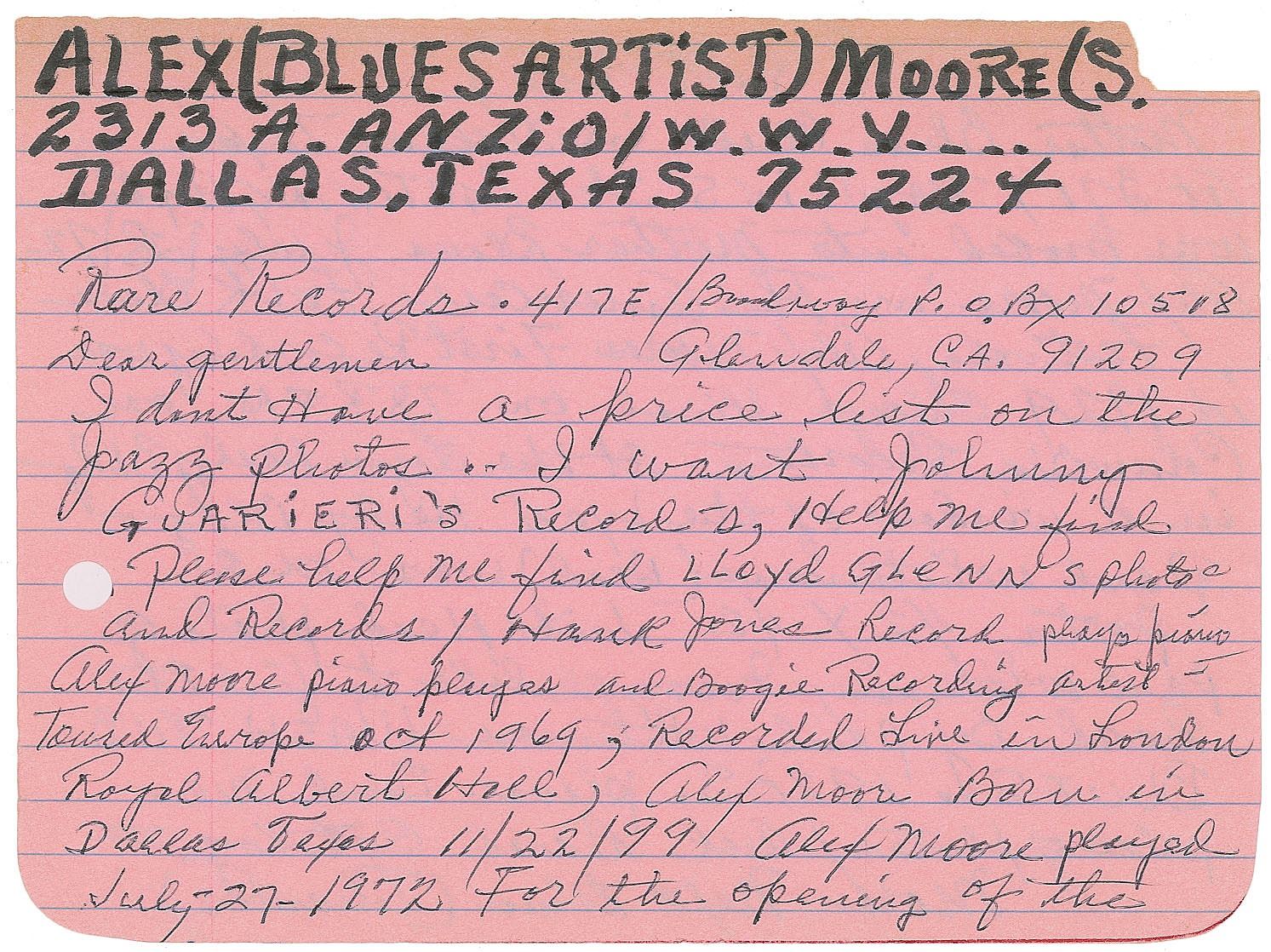 Eccentric blues pianist, singer and whistler (1899–1989) who is best remembered for his recordings of 'Across the Atlantic Ocean' and 'Black Eyed Peas and Hog Jowls.' Three handwritten letters signed multiple times within the text, "Alex Moore" and "Whistlin Alex Moore," five total pages, each approximately 8.25 x 6.5, stamp-dated between 1971 and 1984. Each letter is addressed to Ray Avery at Rare Records in Glendale, California, and consists of Moore requesting hard-to-find books, photos, records by Johnny Guarnieri, Lloyd Glenn, Hank Jones, and Blind Norris McHenry, and adding various career and biographical information. In overall very good to fine condition, with scattered light creasing, and some old tape to one of the letters. Accompanied by four original mailing envelopes, each addressed in his own hand by Moore, who incorporates his signature in the return address field of two envelopes.