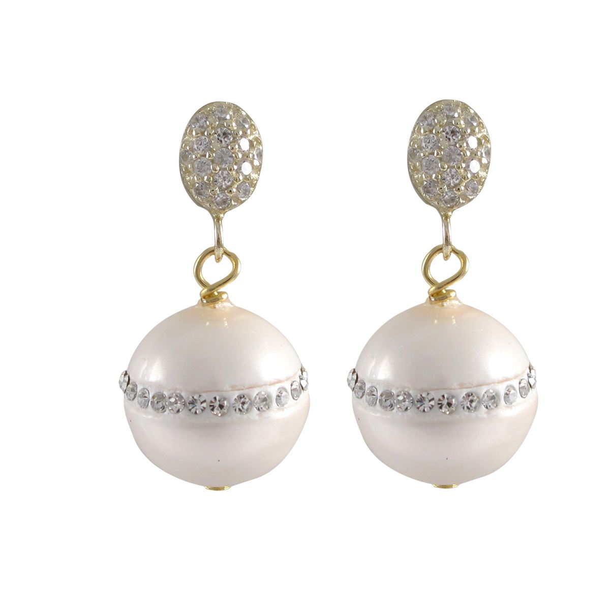 White 12Mm Round Shell Pearl With Crystal Row In Center, On Gold Plated Sterling Silver CZ Post Earrings, 0.95"