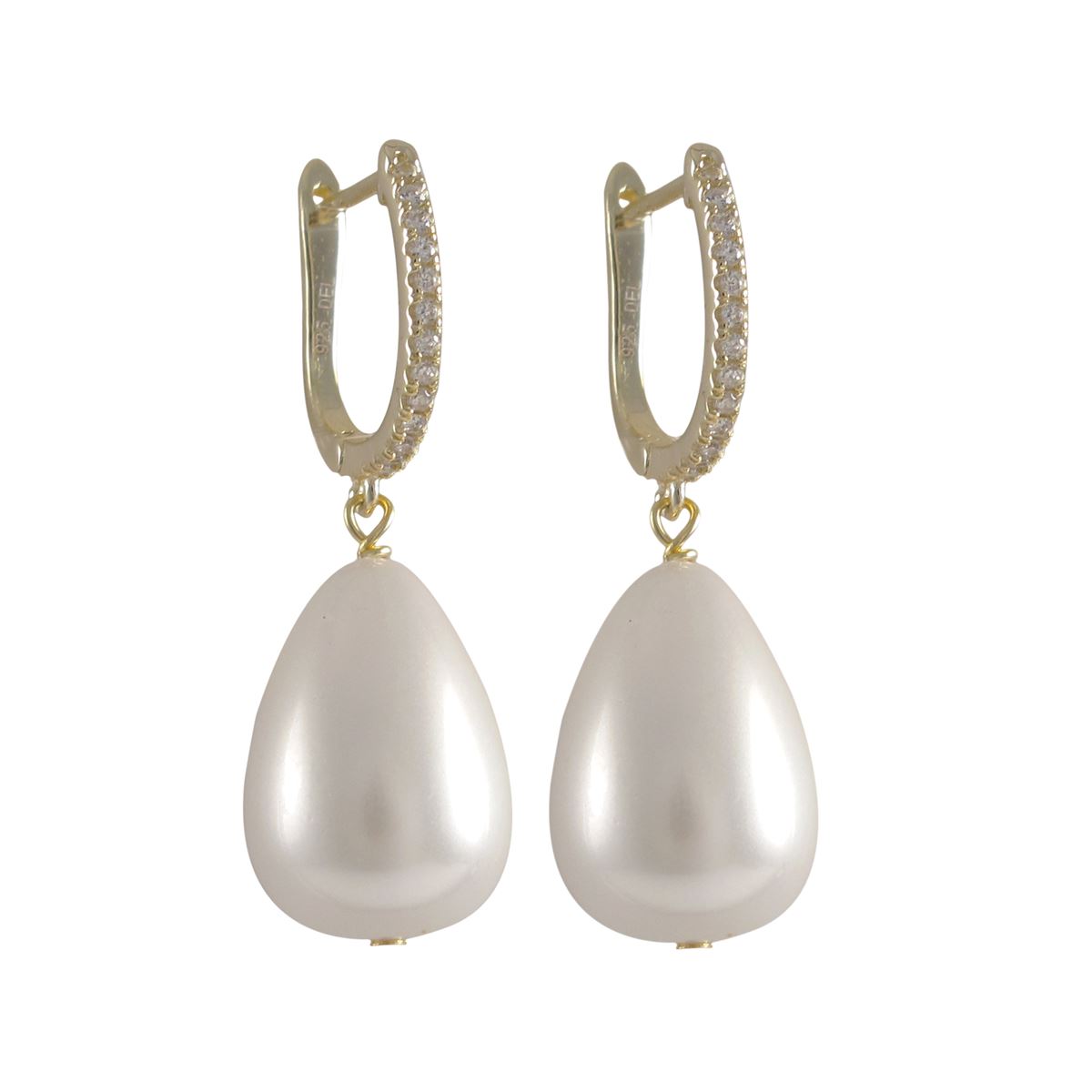 White 13X18mm Teardrop Shell Pearl, On Gold Plated Sterling Silver CZ Lever Back Earrings, 1.41"