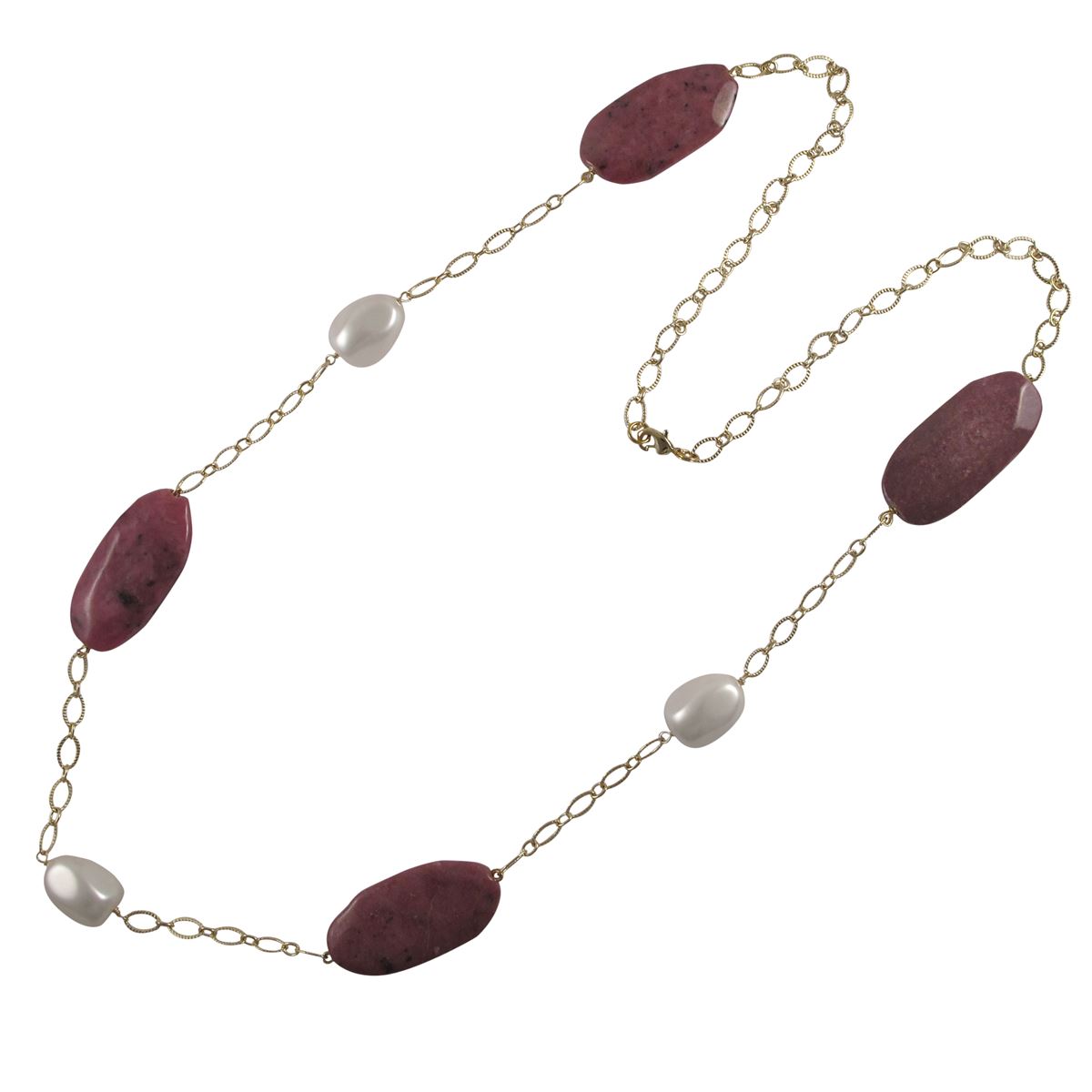 White 16X20 Baroque Shell Pearl With Rhodonite(Pink) Semi Precious Stones On Gold Plated Brass Chain Necklace, 36"