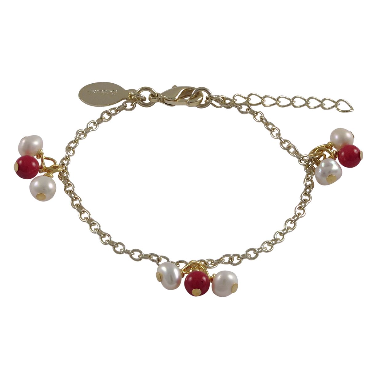 White 4Mm Fresh Water Pearls And Red 4Mm Balls Dangling, Gold Plated Brass Chain Bracelet, 4" 1"