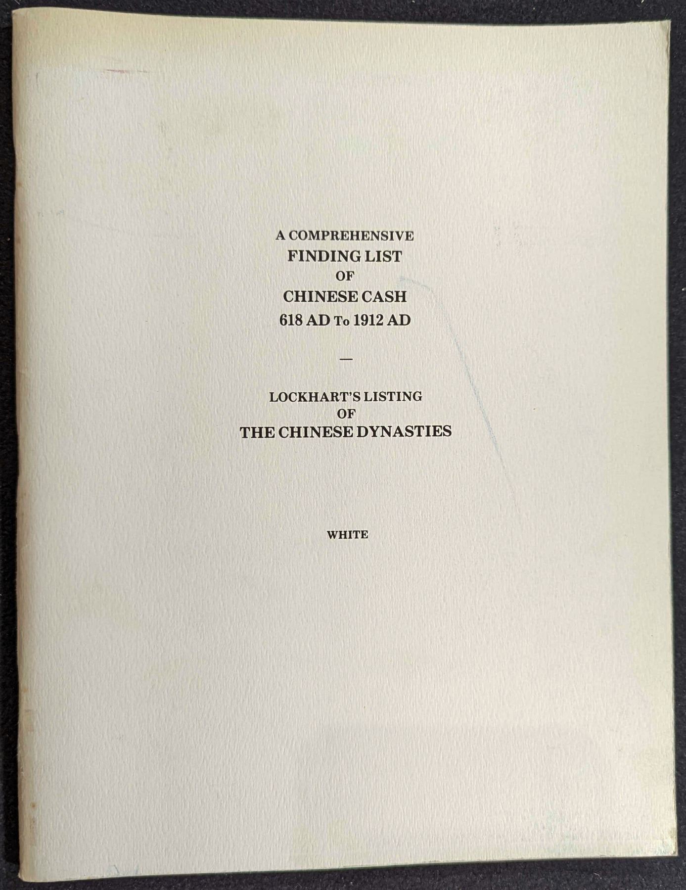 White, R. Byron & Marjorie White. A COMPREHENSIVE FINDING LIST OF CHINESE CASH. T'ANG TO REPUBLIC. K'AI YUAN TO MIN KUO, 618 AD TO 1912 AD. TOGETHER WITH LOCKHART'S LISTING OF THE CHINESE DYNASTIES. BAI Publications, Sheldonville. 1976. 4to. NP pages. Original white card covers. Tables with symbols. Fine. This book is intended to facilitate the procedure of quick identification and assignment of a reference number to Chinese Cash coins. The currently available references have been compared and the results shown in the charts. The Nien-hao list has been made as complete as possible even though none of the usual references picture the coin. The intent has been to list all Chinese and only Chinese cash from the K'ai Yuans of T'ang to the Republic. Included are both those belonging and not belonging to the regular dynastic line; where there is a question of origin it is noted. A number of pieces are listed with reference only by Smith and Coole. If such a piece is at hand, it must be rare. The listings from Coole must be followed for more complete identification. Of the references given, Smith will be published about. the same time as this book. The Glover collection by Lockhart is not available but many old collections are listed by Glover numbers. The procedure is simple: find the top character of the coin in either the Alphabetical or Character Index, refer to the given number in the charts and there find the second character of the Nien-hao. The dynasty and date given are for the first listed coin of that Nien-hao in that book. The last pages of this book are a reprint of the Chinese Dynasty tables from Volume III of the 'Currency of the Farther East' by J.H. Stewart Lockhart. The listings of the dynasties not belonging to the regular line are very difficult to find. There are other listings that do not agree. with these but the differences are usually in minor detail of a few years in the date of accession or date of adoption of a Nien-hao. There are, of course, other Chinese cash-like pieces not covered by these listings, the commemorative pieces. palace coins and amulets. Lot weight: 0 lbs 7oz. Subject(s): Chinese Coinage.
