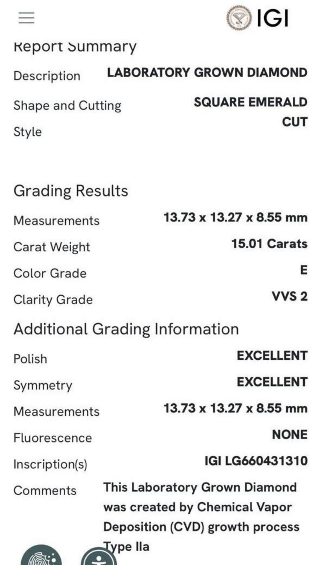 Lab Grown Asscher Diamond 15.01 Cts - ....Clarity - E/VVS..Size - 13.73 x 13.27 x 8.55 MM .Certified By IGI lab (laser inscripted IGI certification number on this Diamond)