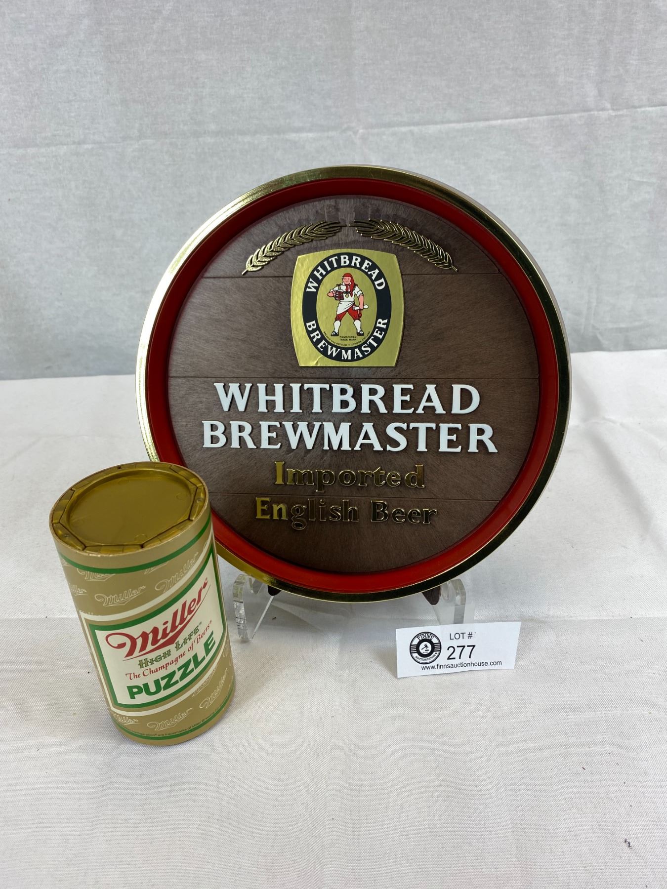White Bread Brewmaster Imported English Beer Round Stand Up Sign, 9" Diameter And A Miller High Life Puzzle