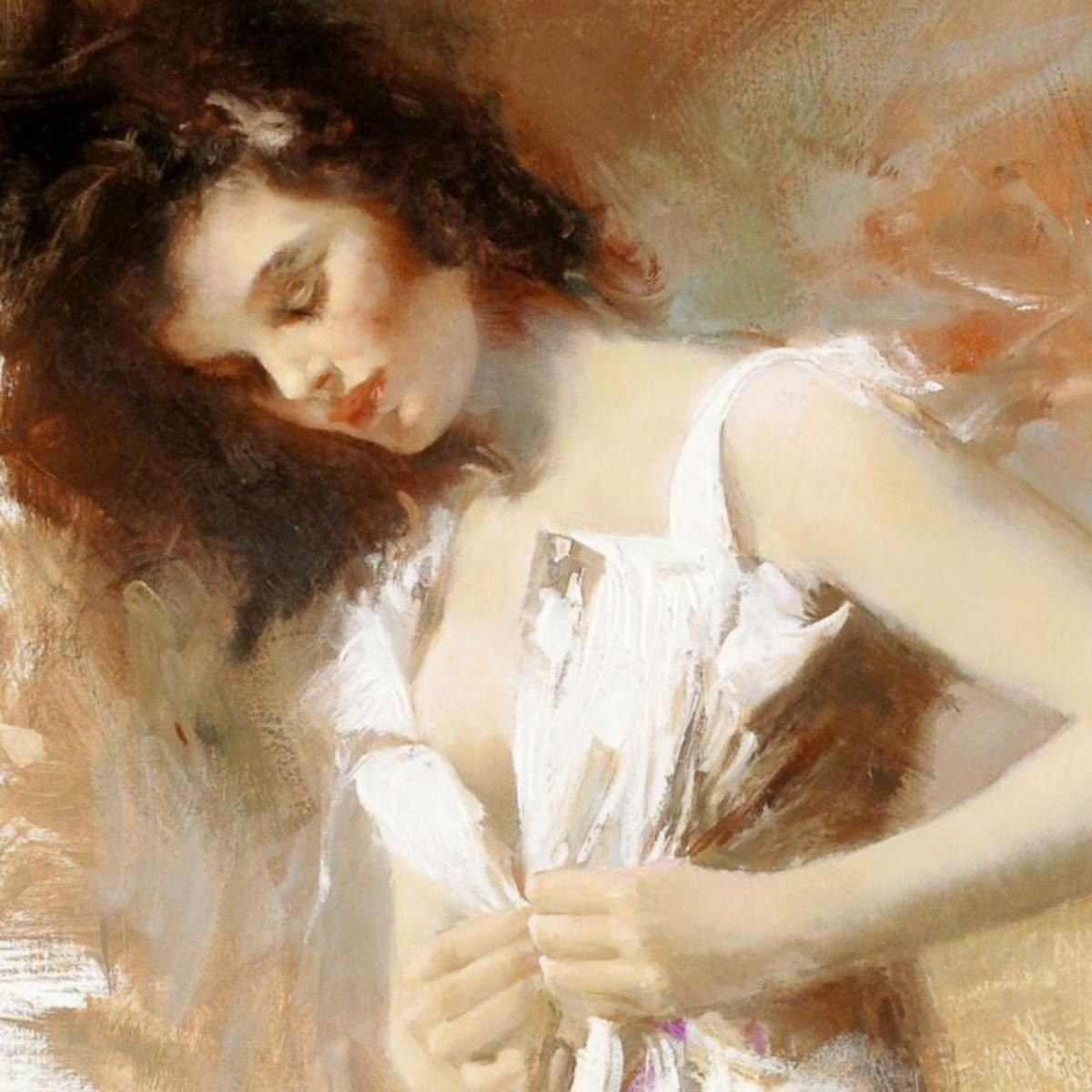 Pino's portraits allow glimpses into intensely personal, intimate spaces, conveying emotion through rich, warm color and sensual brushwork. "White Camisole" is a limited edition giclee on canvas that has been hand-embellished by Pino himself, numbered and hand signed by Pino (1939-2010). Includes Certificate of Authenticity! Measures approx. 10" x 14" (image). Reference #: 166046.