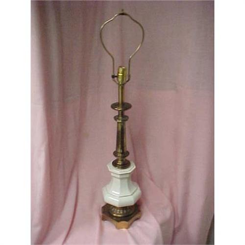 </font></strong>White Ceramic Lamp. This white ceramic lamp has gold trim and metal base and neck. This lamp is 35? tall and roughly 7? wide. In good condition, but needs new cord. Maker and year unknown. </font>