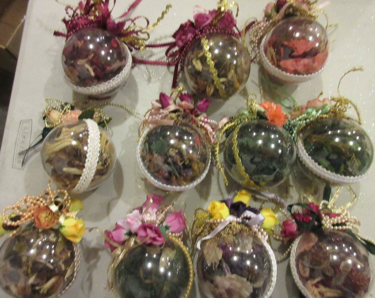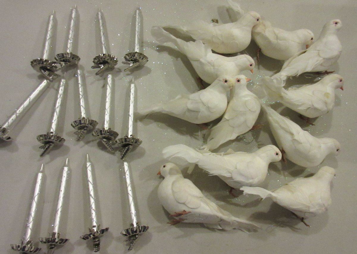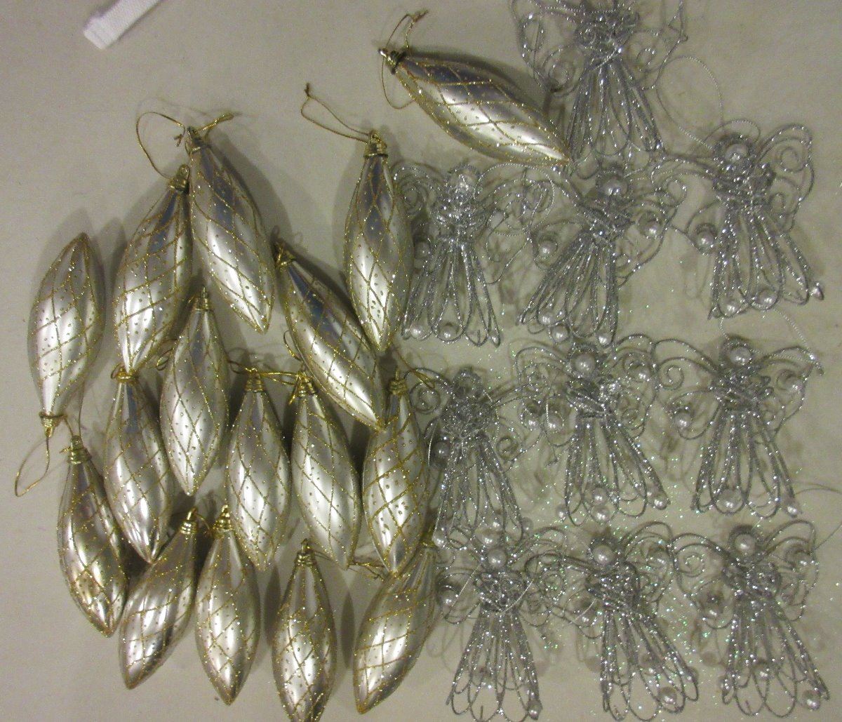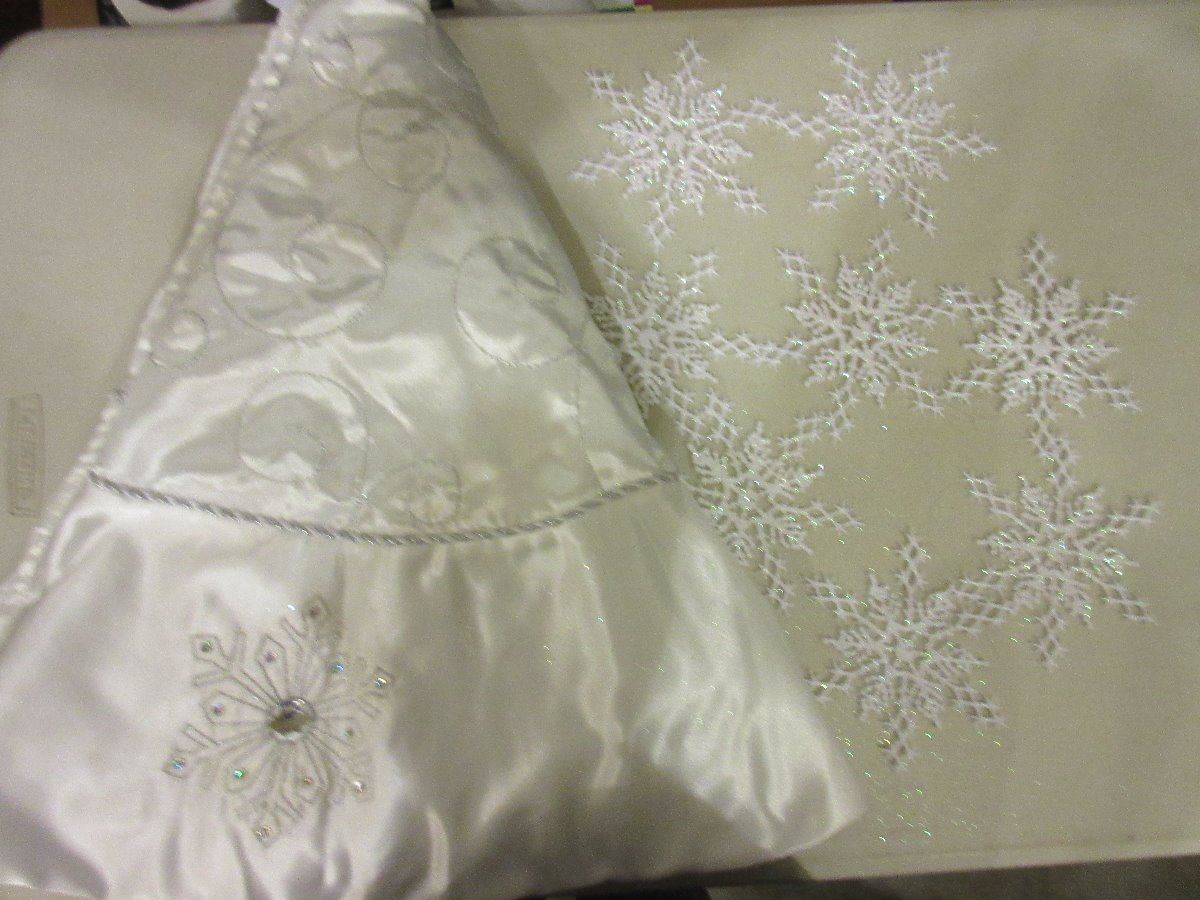 White braided gem stone Tree Skirt, 24 Snowflake deck, 16 oblong silver/gold deco, 9 angels, 10 doves, 12 candle stick, Plastic filled with flowers and potpourri
