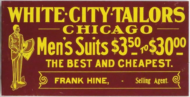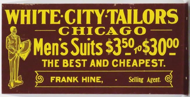 White City Tailors Tin Flange Sign for Frank Hine, Selling Agent. Embossed tin and light steel flange. Some minor edge ware otherwise Excellent Condition. 14 1/4 X 7 inches.
