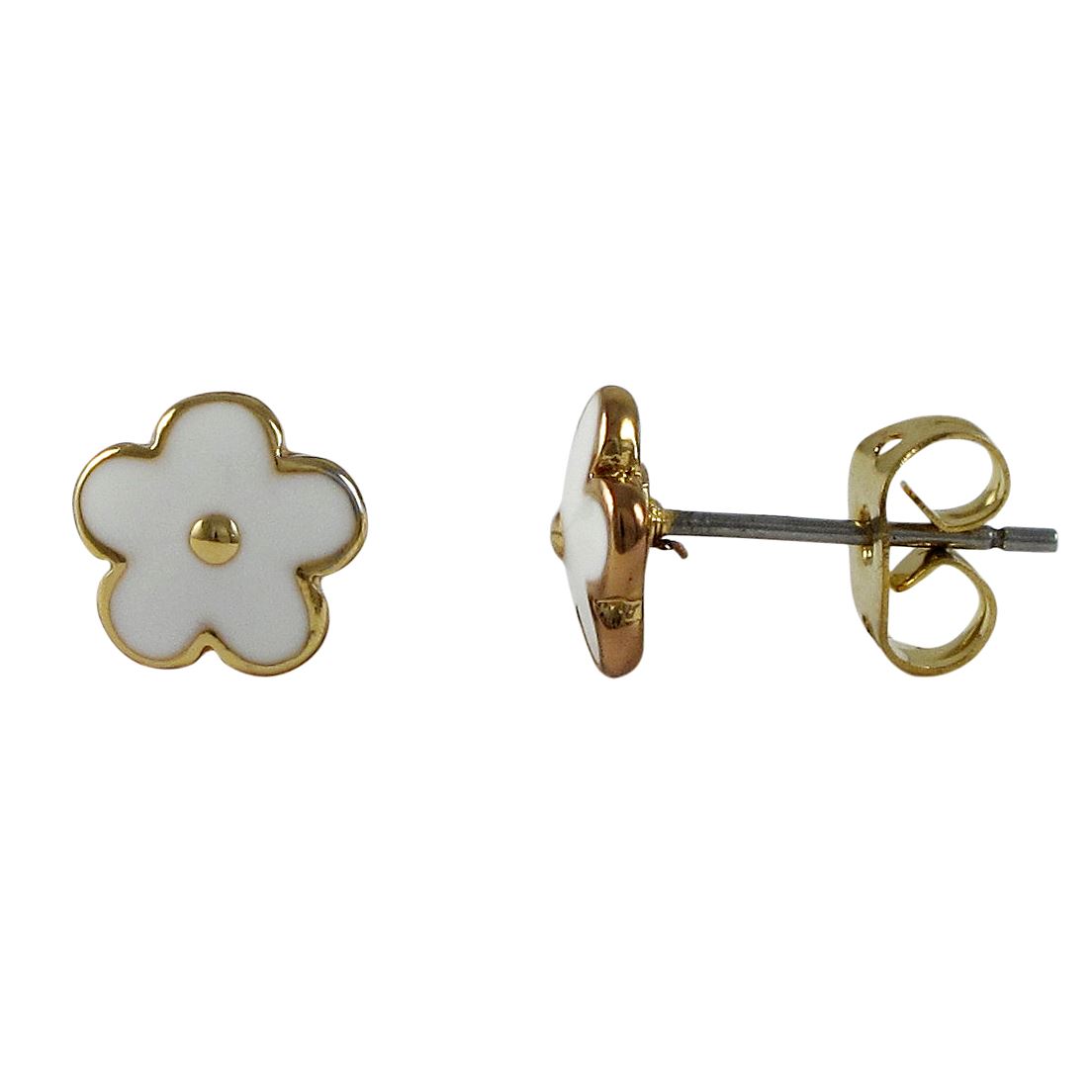 White Enamel Flower On Gold Plated Brass Post Earrings 8Mm