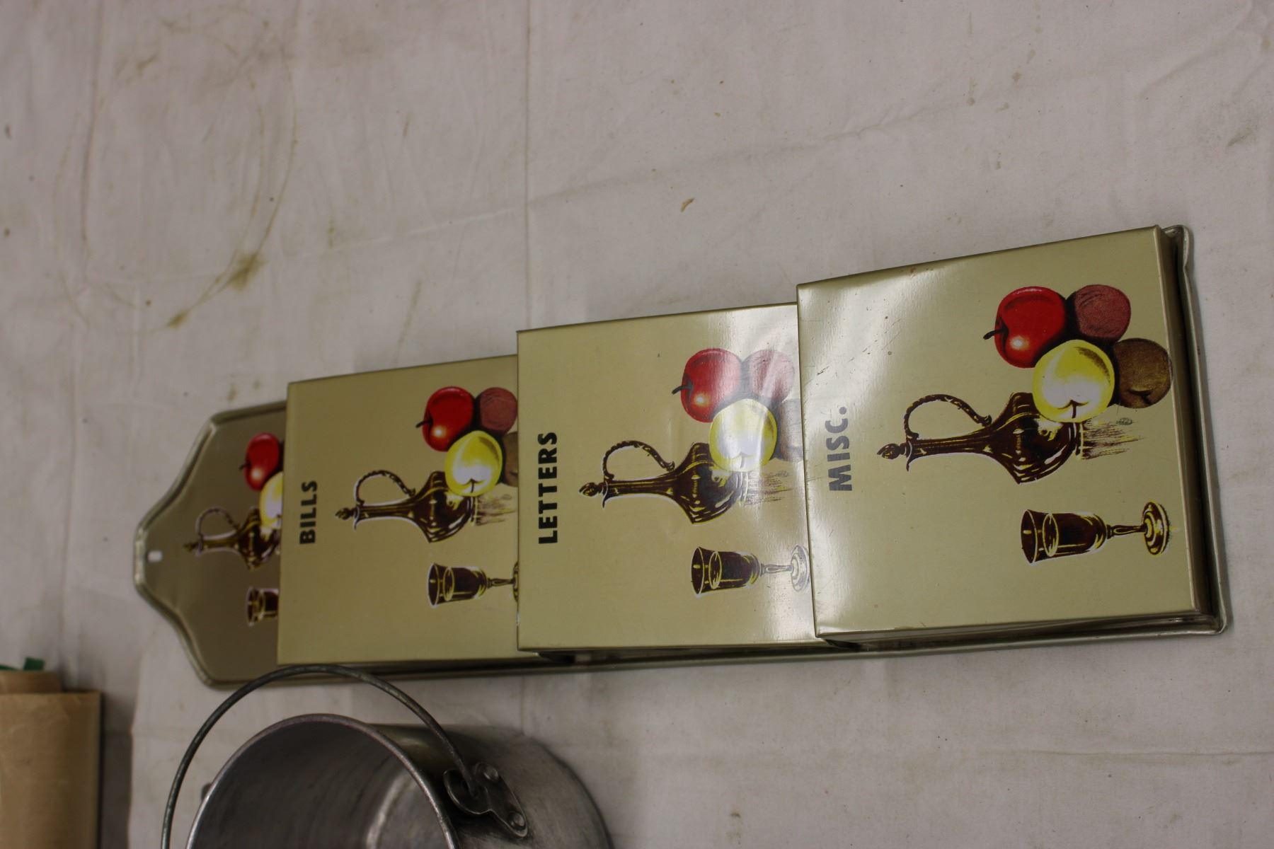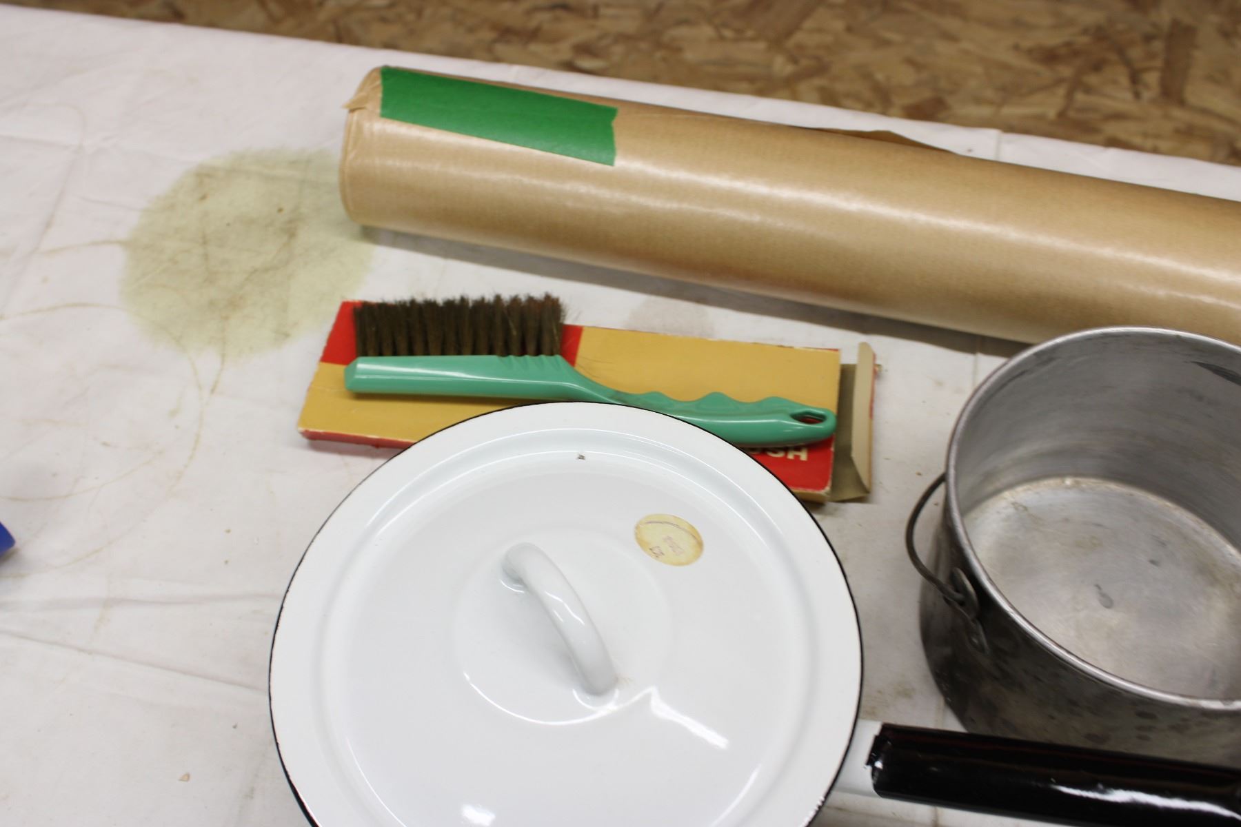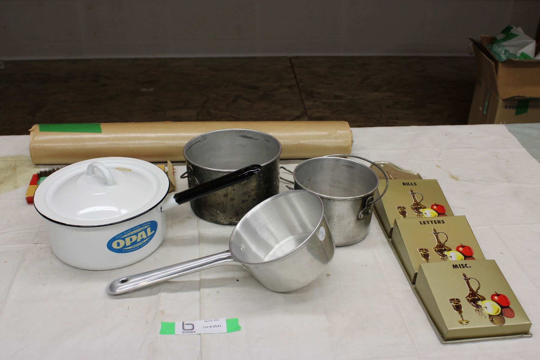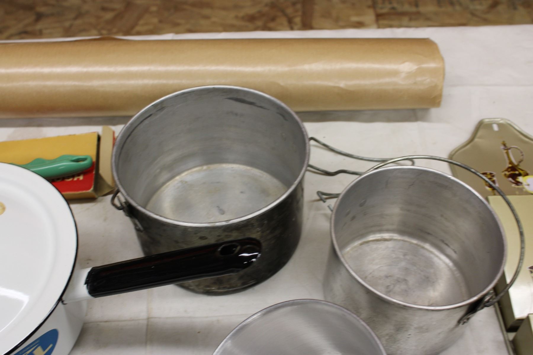 White Enamel Pot with Lid and Assorted Kitchenware