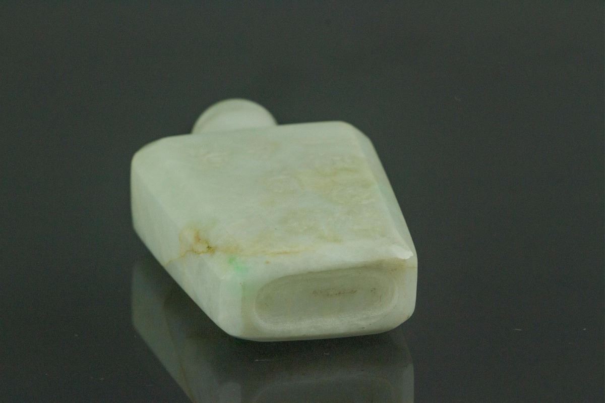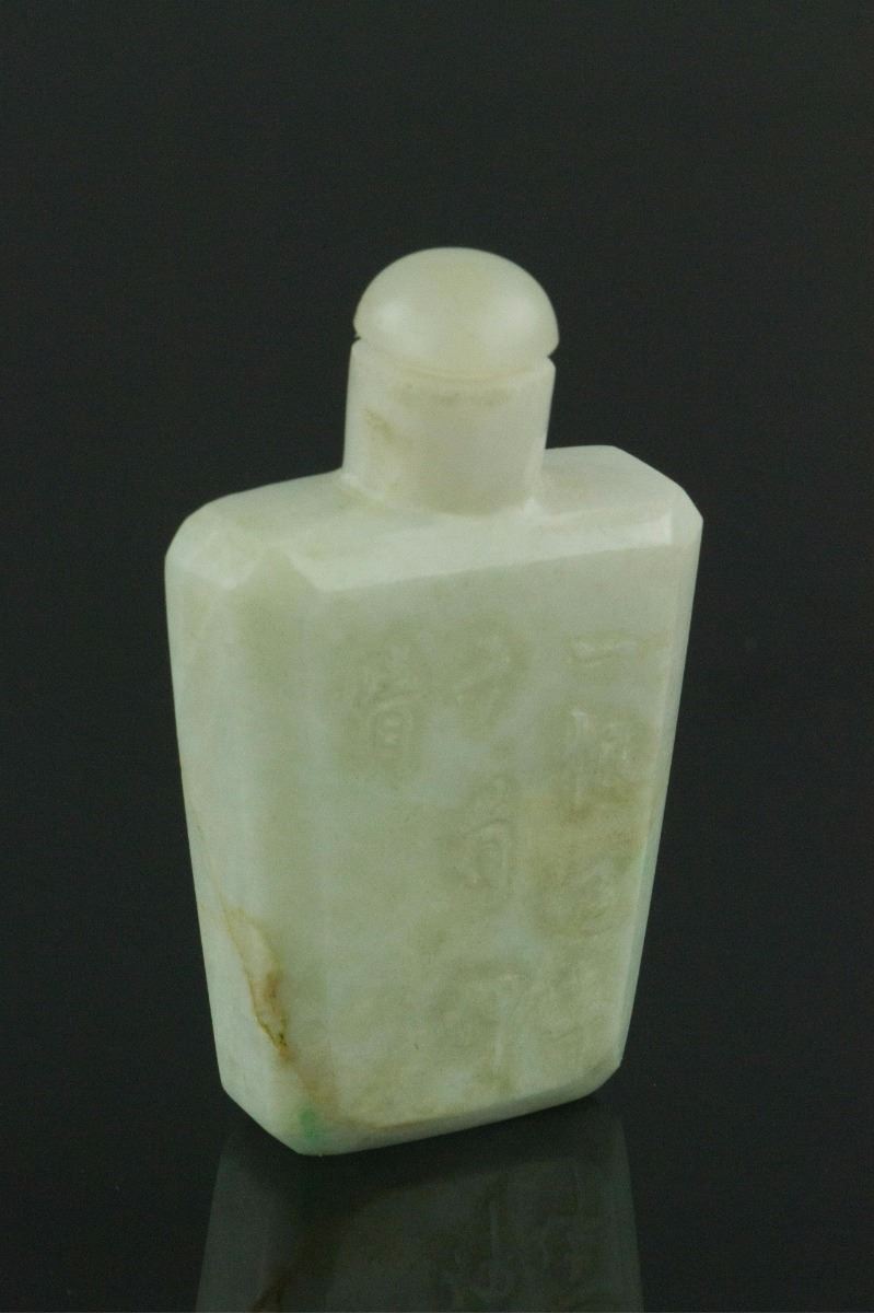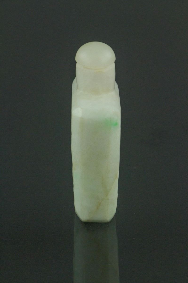 Chinese fine jadeite snuff bottle; of rectangular section; carved with poem calligraphy in low relief; of white tone with a touch of apple green; H: 6 cm, D: 3.5 cm, 55 grams