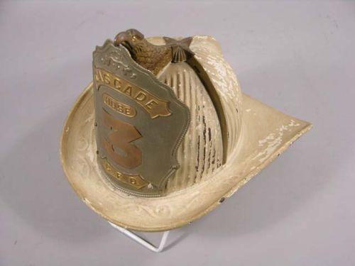 White fire helmet, 8.25" metal front piece with eagle holder. Cascade hose #3, C.F.D. Cairnes & Bros, Manufacturer. Some chipping otherwise good cond.