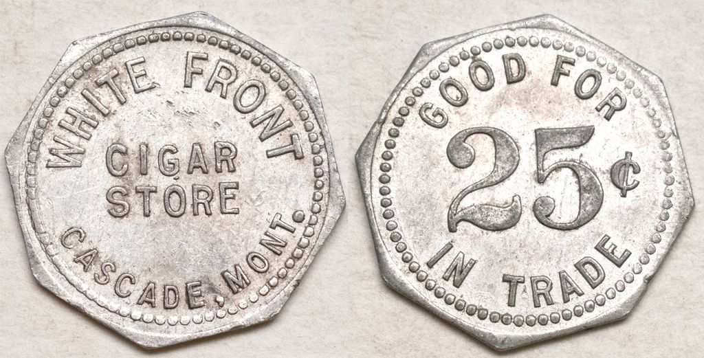 White Front / Cigar Store / Cascade, Mont. // GF 25c IT. The town of Cascade grew out of several other communities. Near the present site of Cascade, but on the east side of the Missouri River, a small town developed at a ferry (nicknamed "The Mayflower") for the Chesnutt Valley freight and stage route. This was the first settlement. Many other followed including Gorham, Ulidia, and St. Clair. Octagonal. Aluminum. RARE!