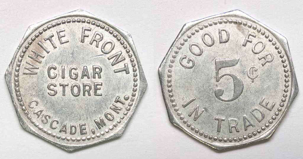 White Front / Cigar Store / Cascade, Mont. // GF 5c IT. Octagonal. Aluminum. RARE!