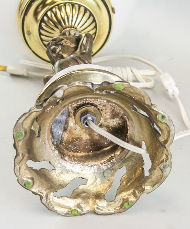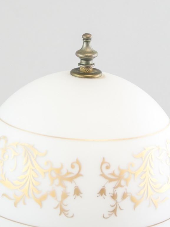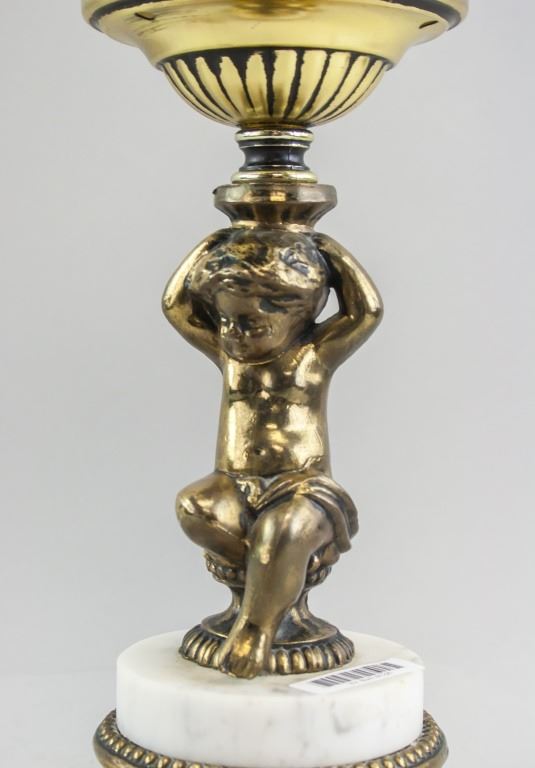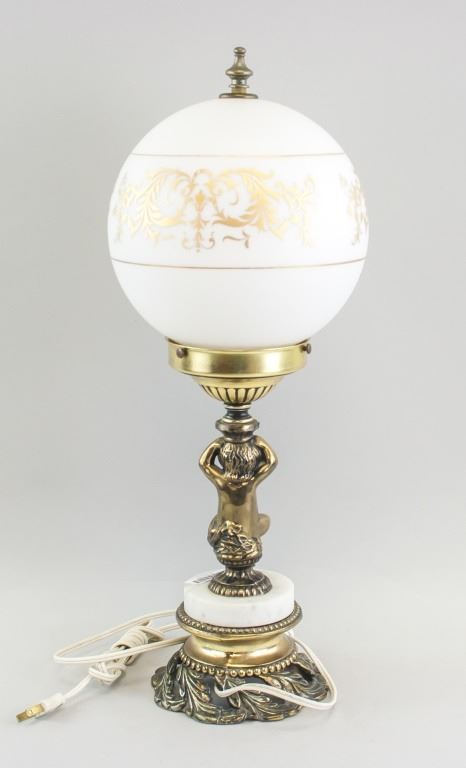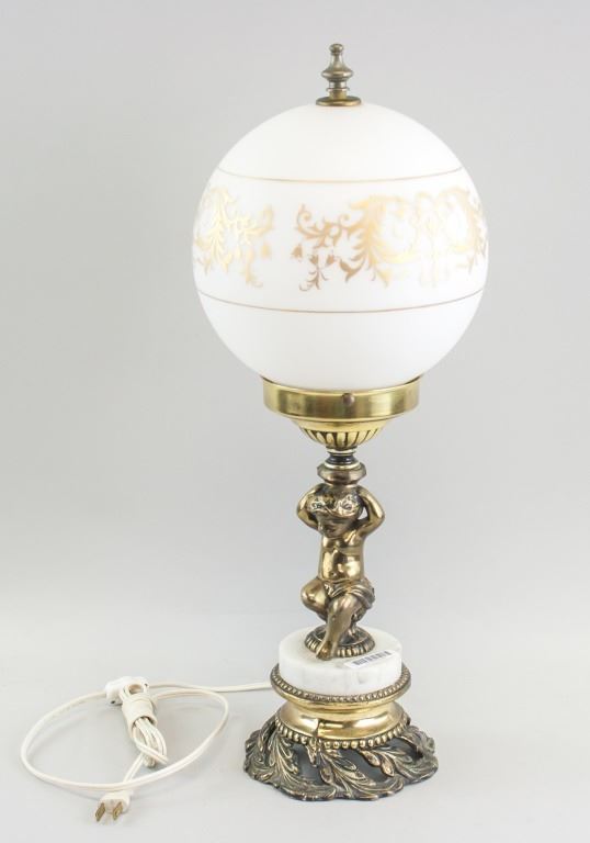 White globe lamp with gold designs, upheld by cherub. 52 x 21 cm. 2 kg. Working condition..