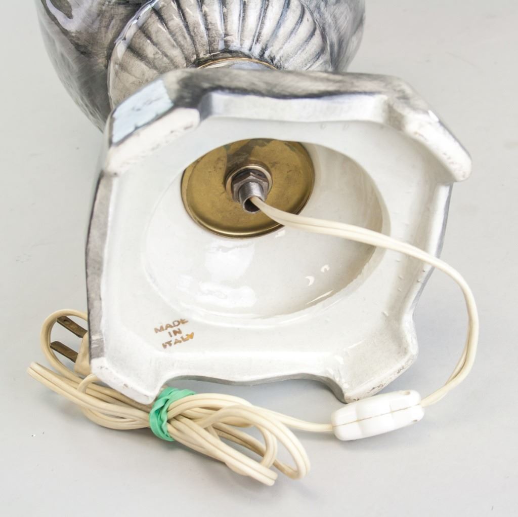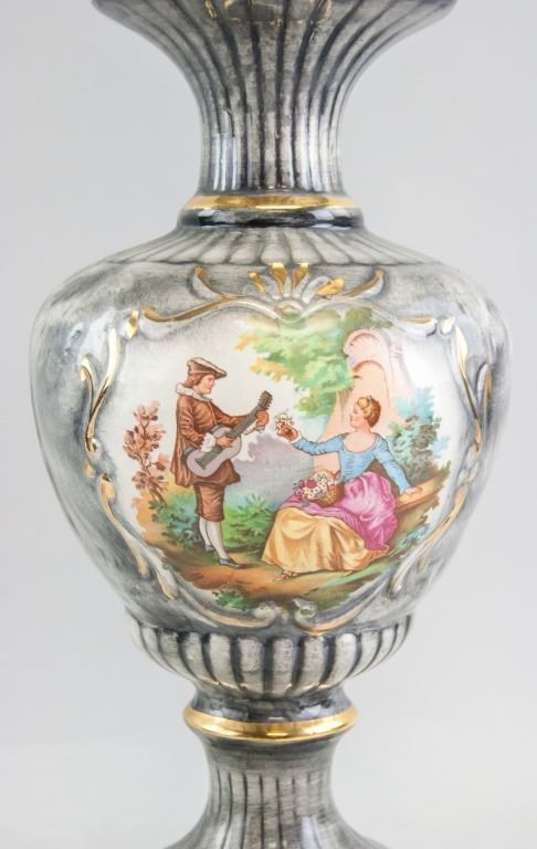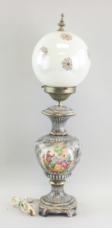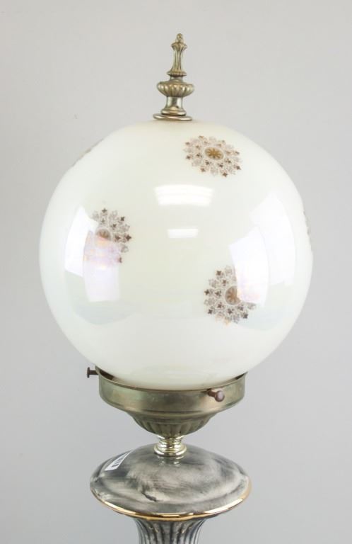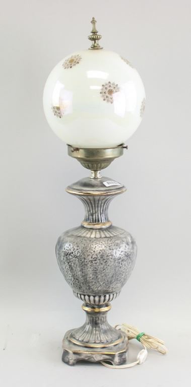 White globe lamp with details. Set a top a vase-like base. "MADE IN ITALY" stamped on base. 68 x 18 cm. 2 kg. Working condition.