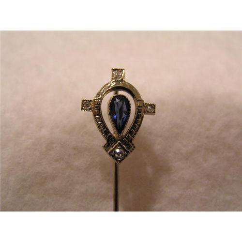 Antique white gold stick pin with one pear shaped blue stone and 4 single cut diamonds ranging from about .01 to .03 carat each. I believe the blue stone is a sapphire.