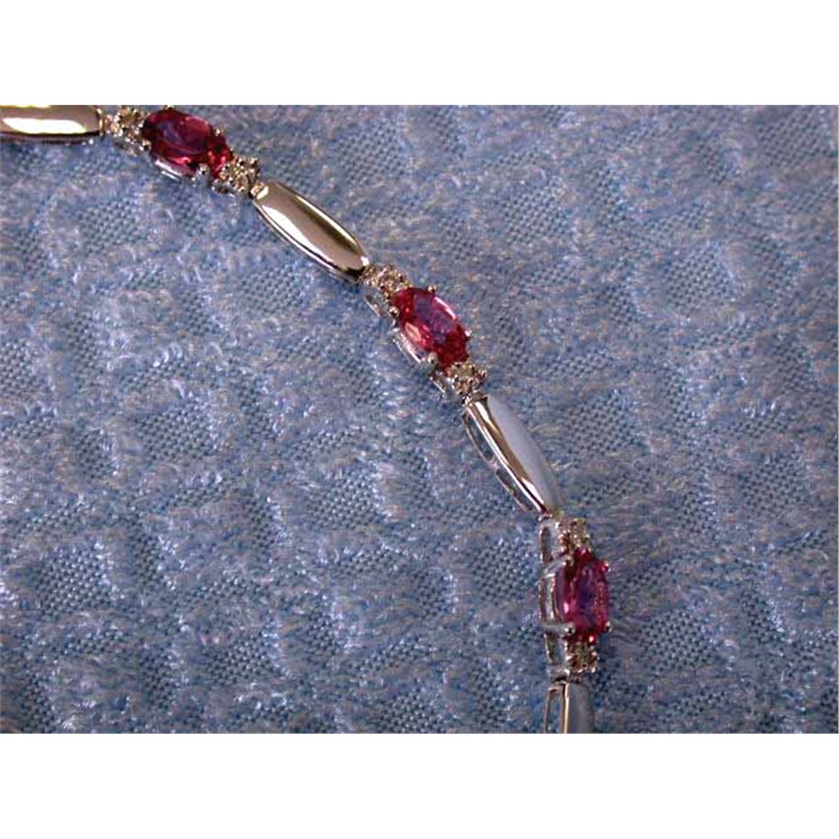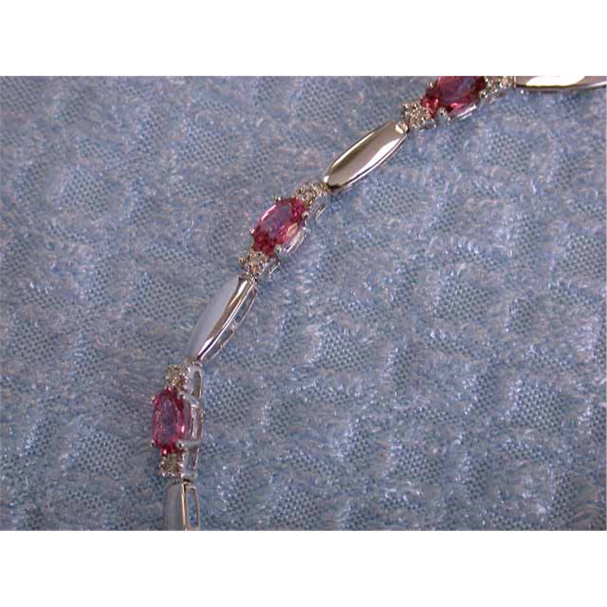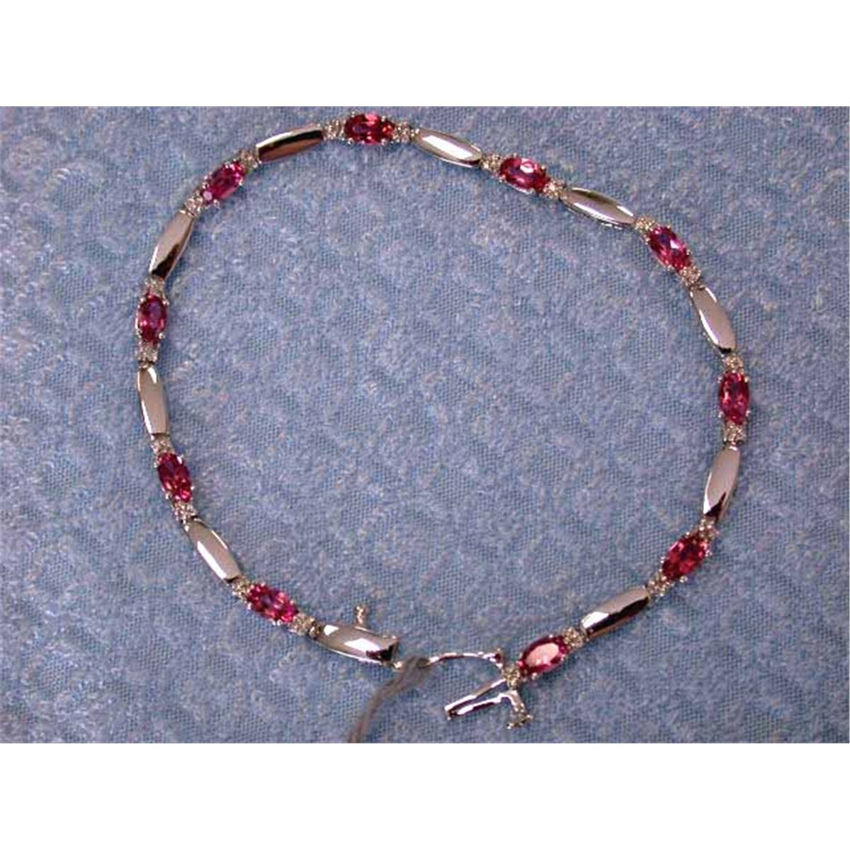 14k White Gold Bracelet w/ 0.11 carats Diamond and 2.31 carats Pink Topaz. It is approximately 7 inches long and weighs 4.70 grams.