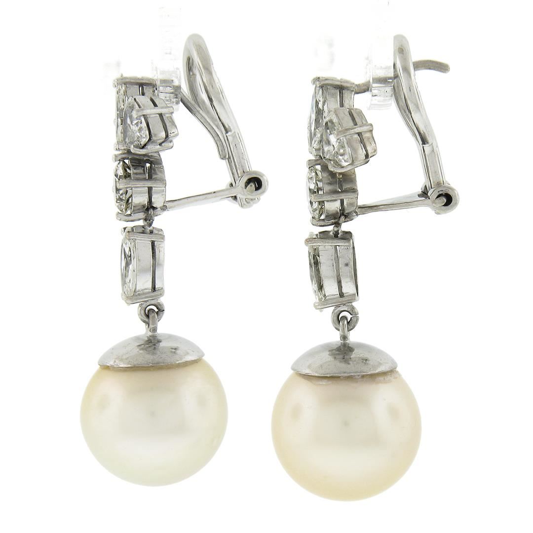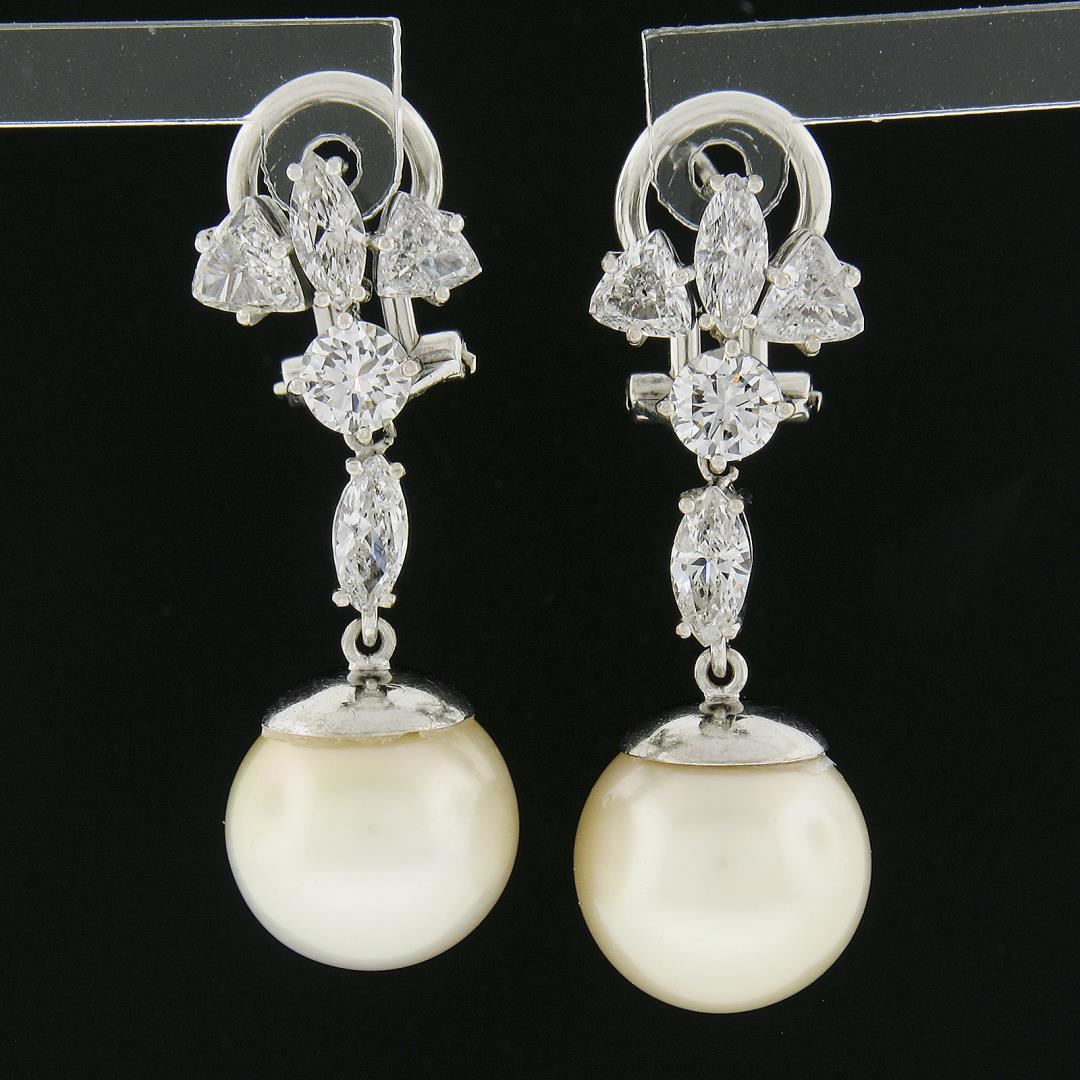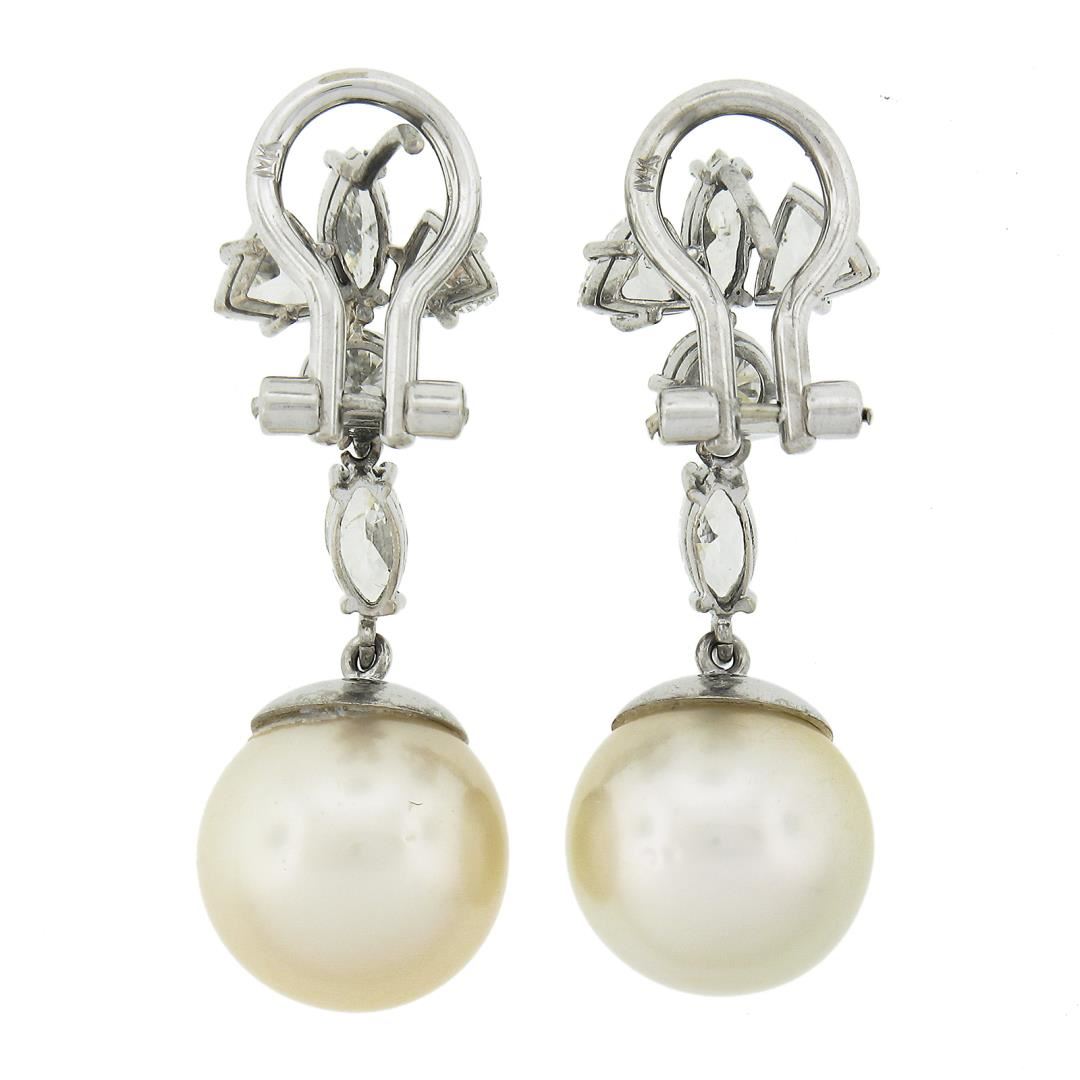 A solid 14k white gold dangle drop earrings, with 2 GIA graded near round shape cultured saltwater pearls (12.10mm & 12.30mm), and 10 trillion, marquise & round cut natural diamonds (H-J - VS2-I1 ; 2.50ctw). The earrings measure approximately 33.3x11.9mm and weigh a total of 11.23 grams. Comes with all original relevant certifications.