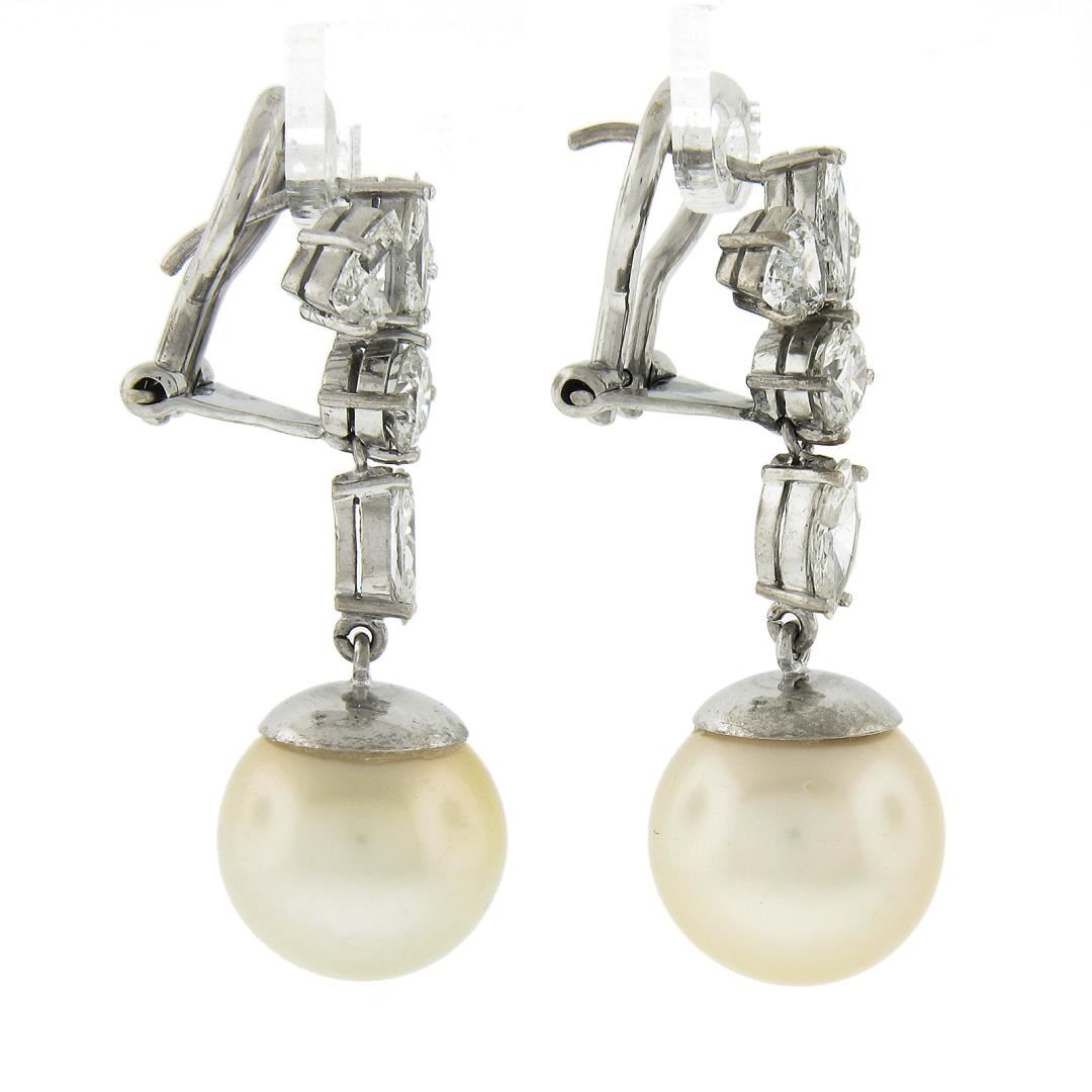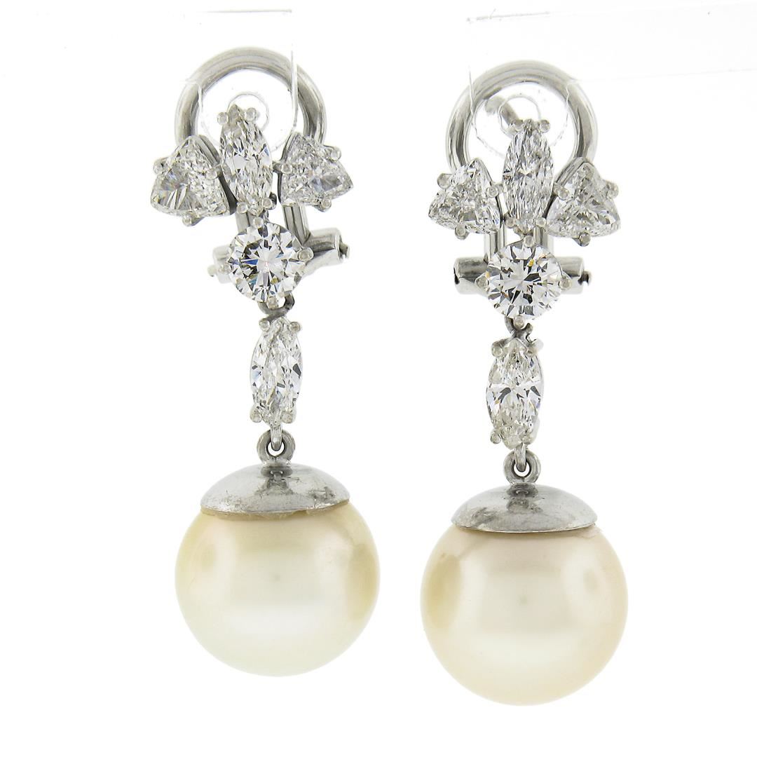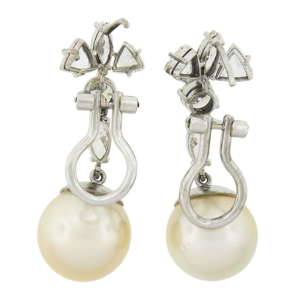 A solid 14k white gold dangle drop earrings, with 2 GIA graded near round shape cultured saltwater pearls (12.10mm & 12.30mm), and 10 trillion, marquise & round cut natural diamonds (H-J - VS2-I1 ; 2.50ctw). The earrings measure approximately 33.3x11.9mm and weigh a total of 11.23 grams. Comes with all original relevant certifications.