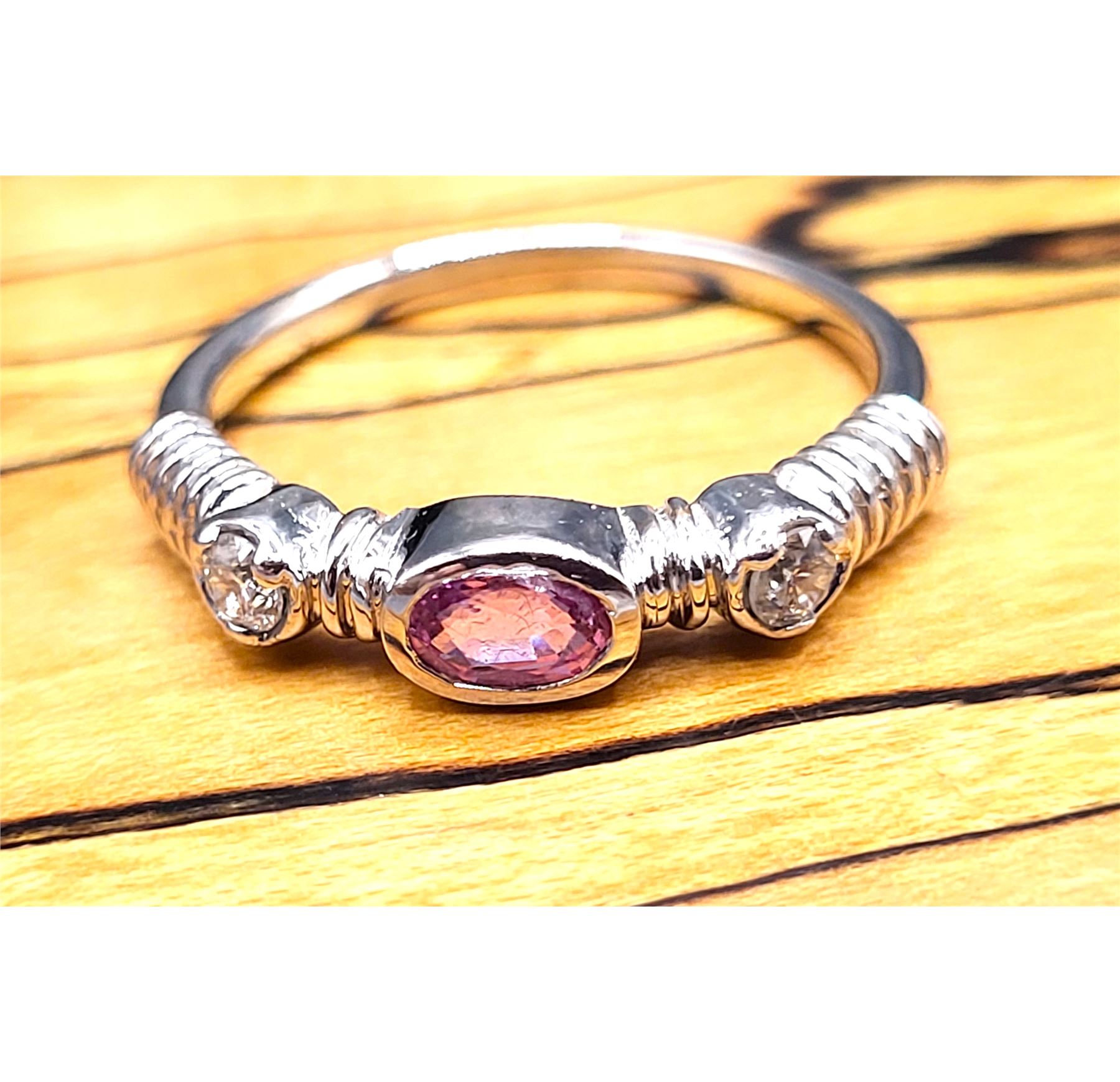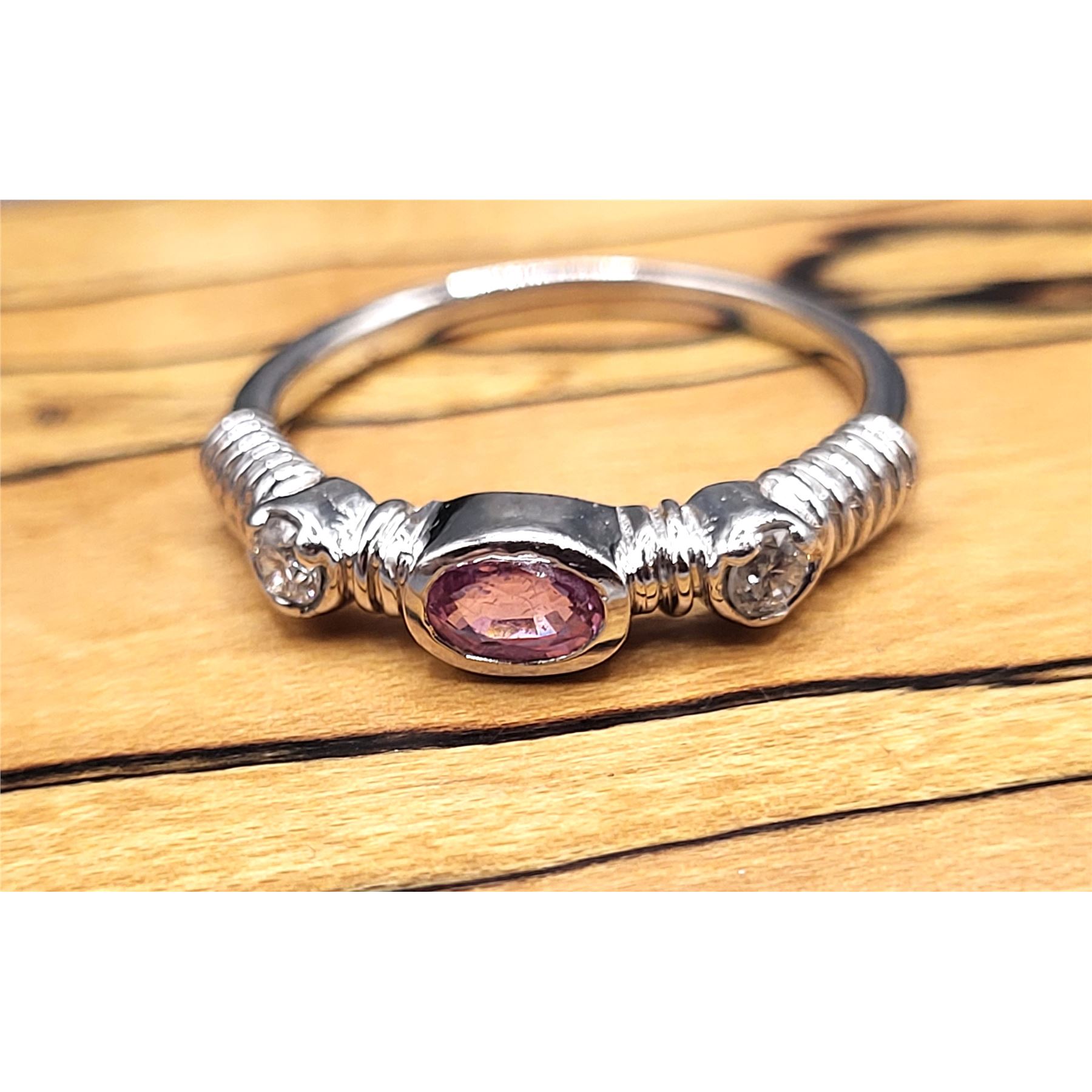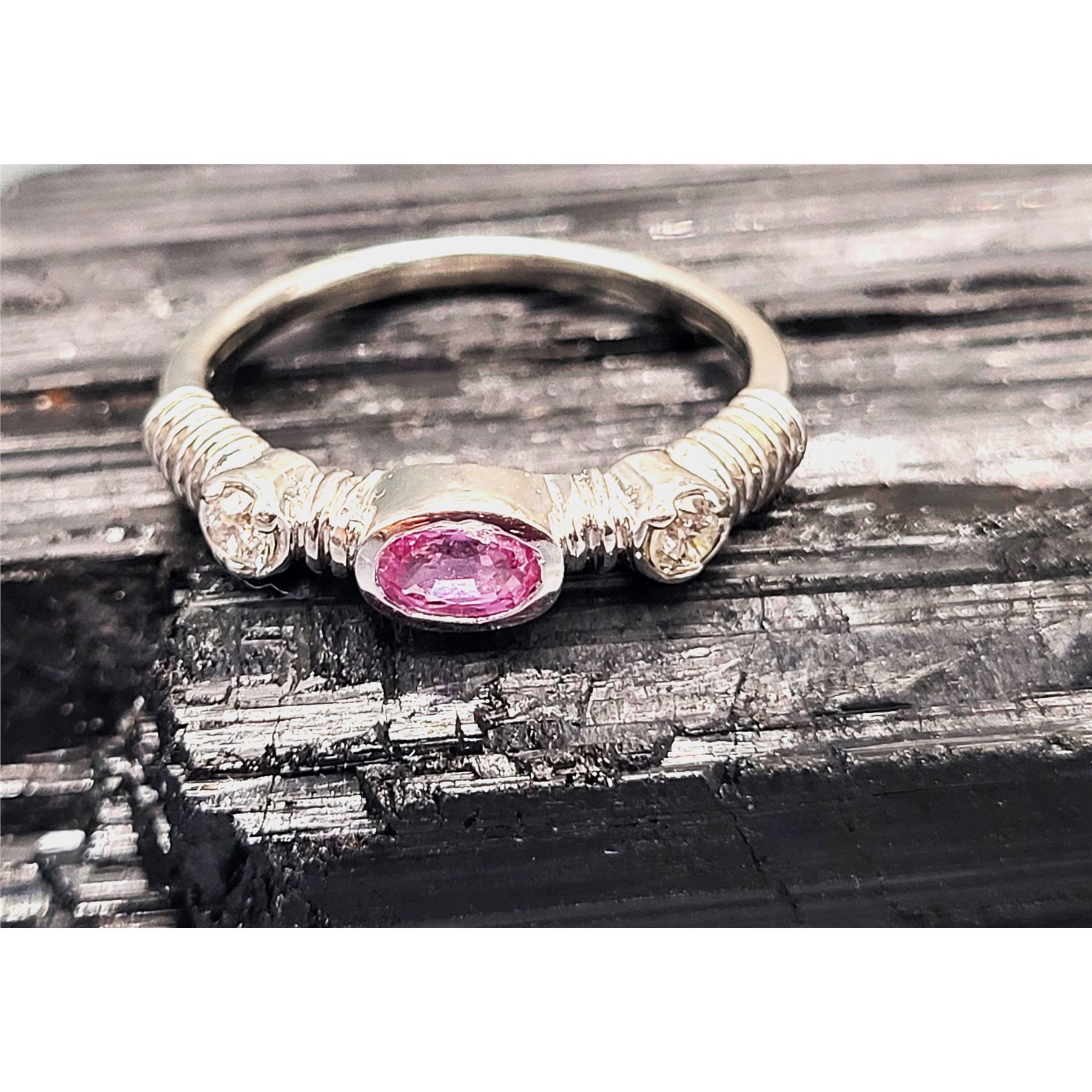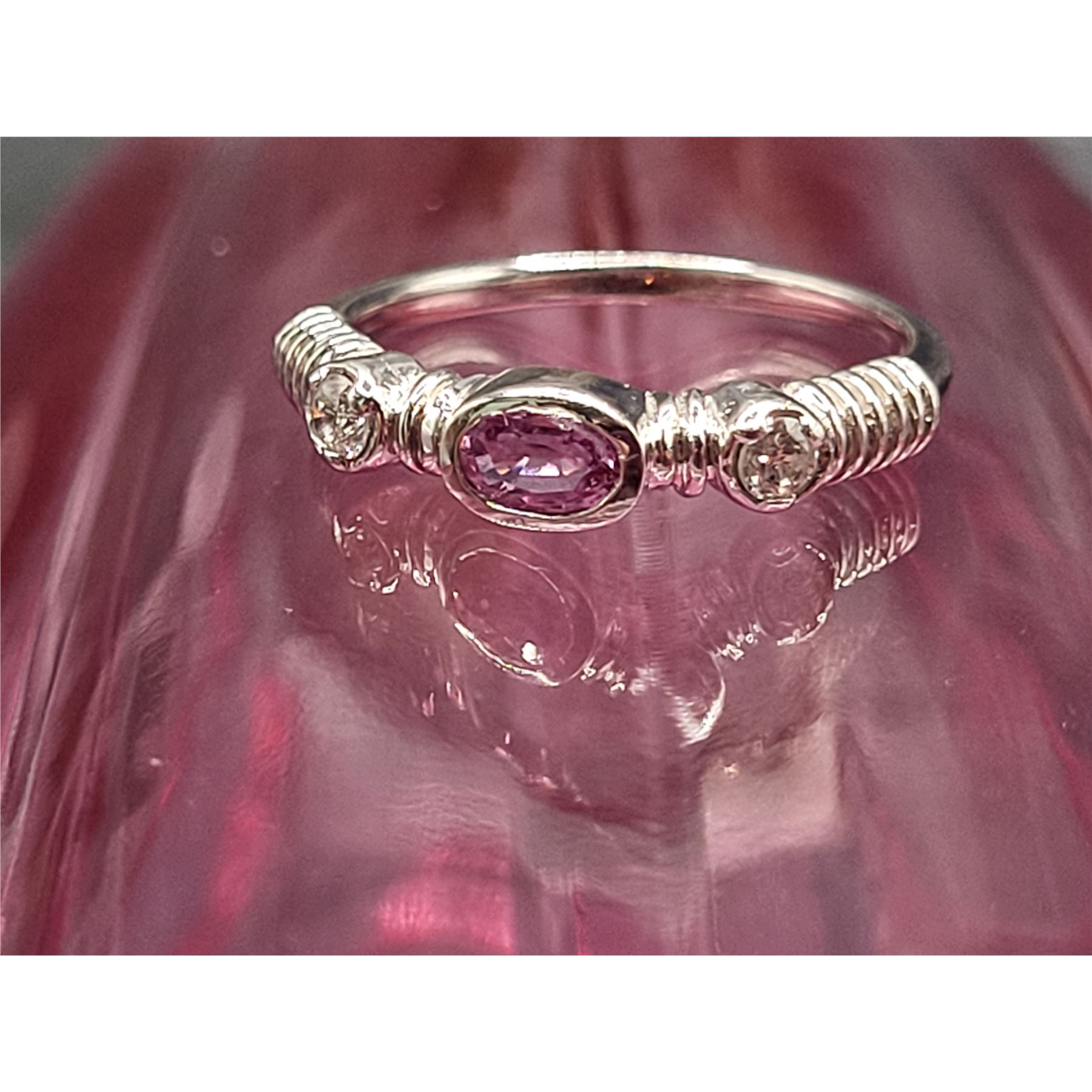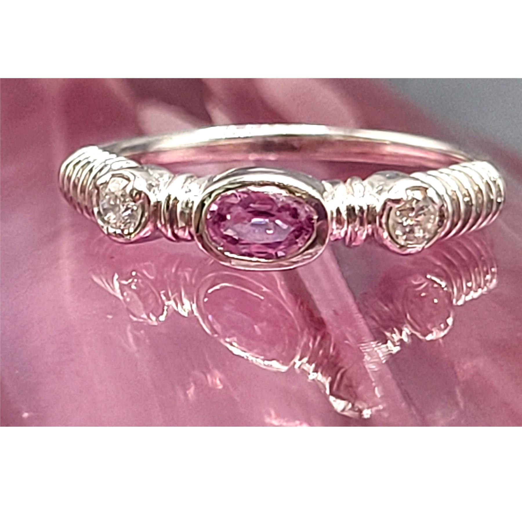 A .33 carat, oval-cut, bezel-set, genuine pink sapphire is featured in this 14 karat white gold stacker ring with ribbed shoulders and .14 carats total weight of round, brilliant-cut, H, SI2 diamonds for accent.& nbsp; This ring is US size 7 and can be sized for an additional charge. Please contact Bidfair Fine Jewelry for sizing details.& nbsp;