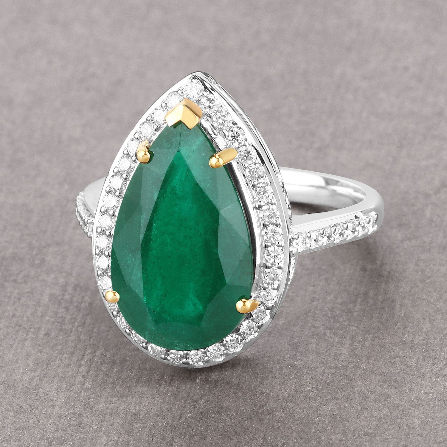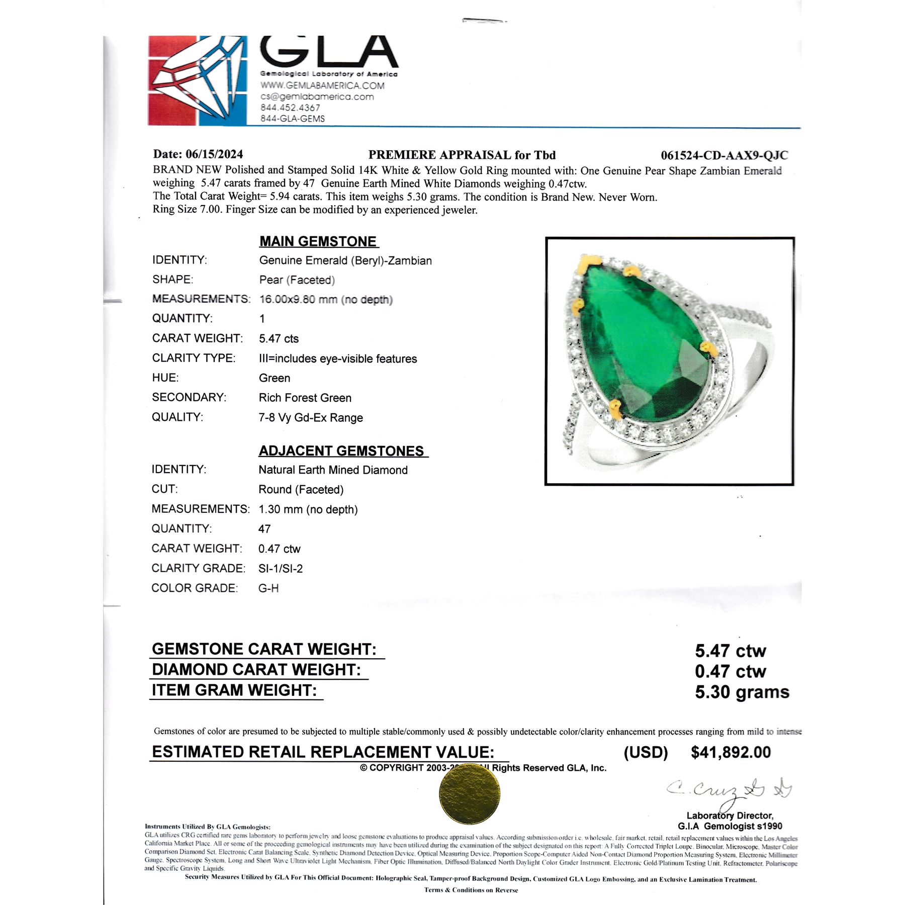 DESCRIPTION DETAIL: Stunning certified 5.47ct pear cut Zambian Emerald set into a classic 14k white gold setting with a 0.47ctw white diamond halo. The ring is a size 7 US.