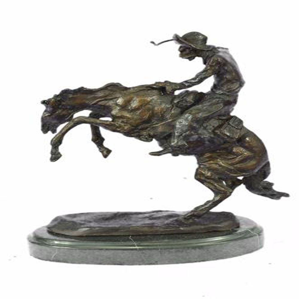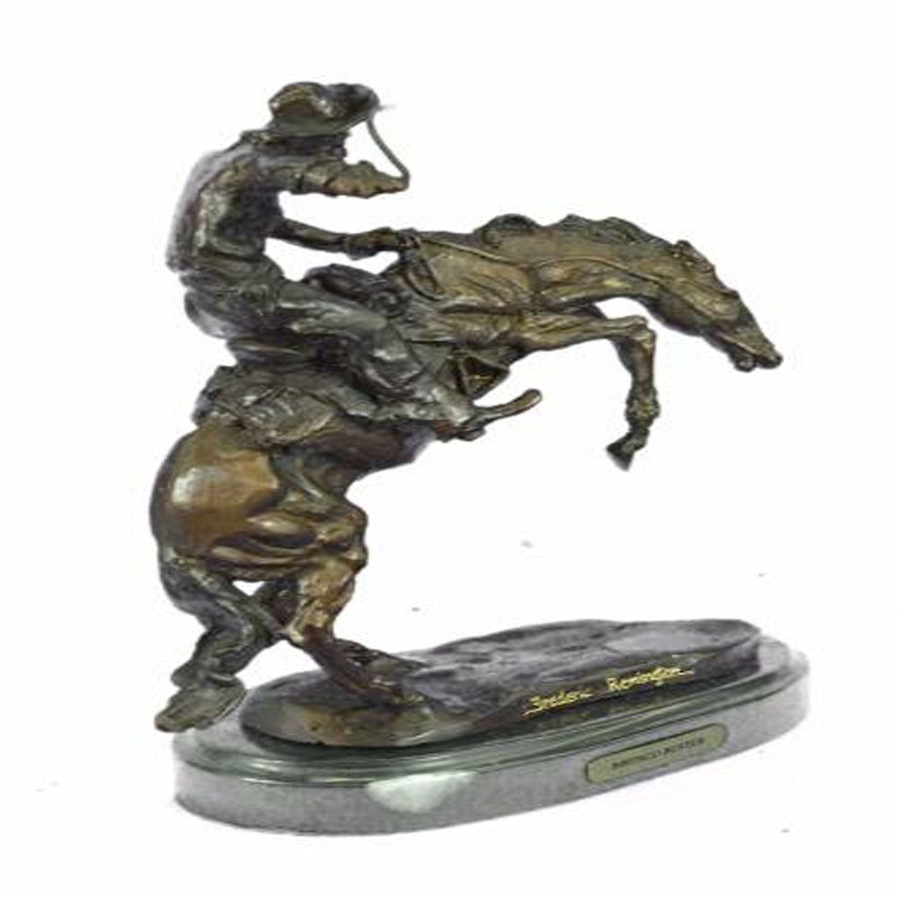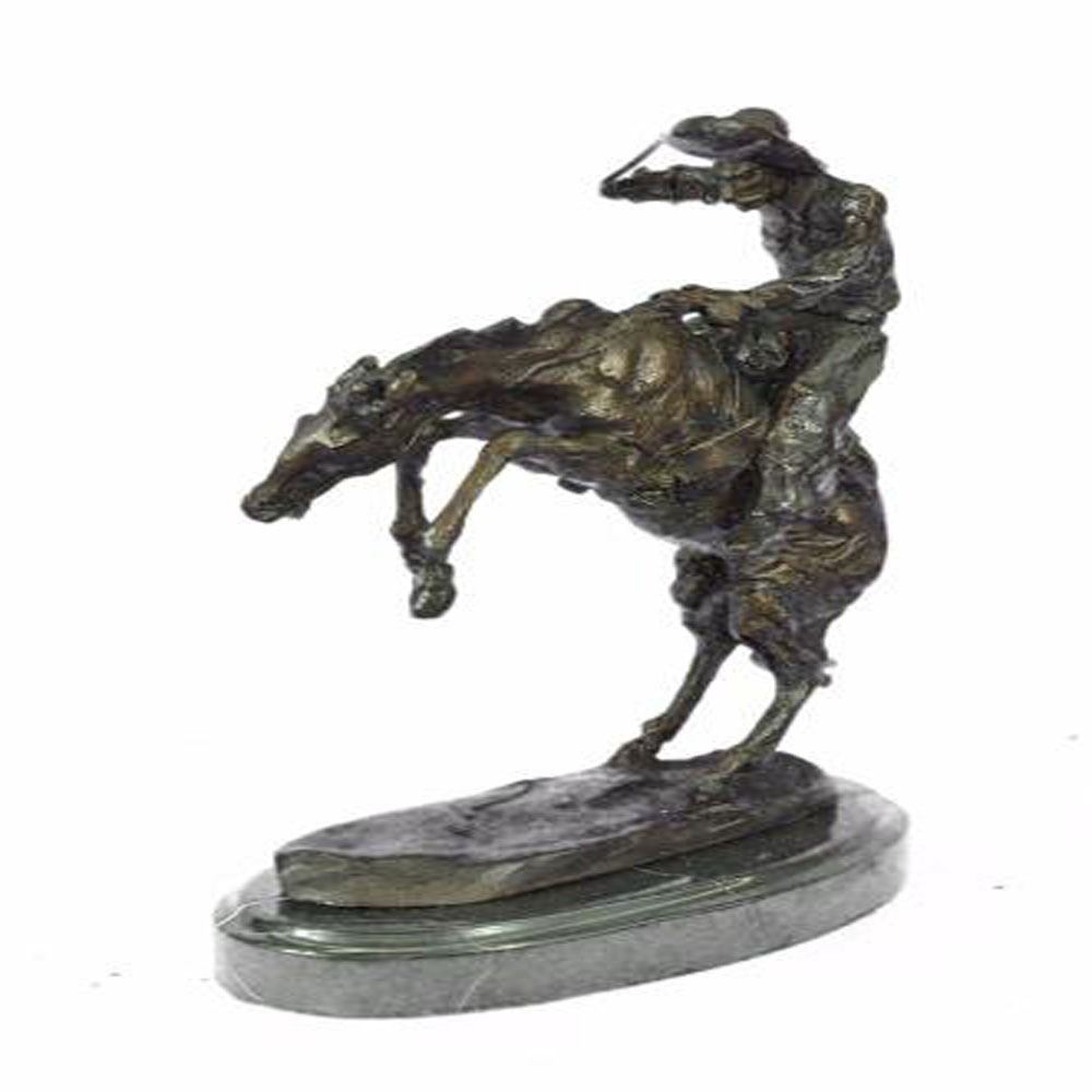 A great American classic, this Statue is of a cowboy on a horse moving fast through the wild wild west! The horse is standing high on his hind legs ready to gallop with some serious speed. The cowboy is dressed in the traditional cowboy hat, chaps, and handkerchief. Heaven has a whip in his right head ready to crack to gain speed. Creating using the lost wax method. Dimensions: Height 10 X Width 9 inches. Weight: 7 LBS.