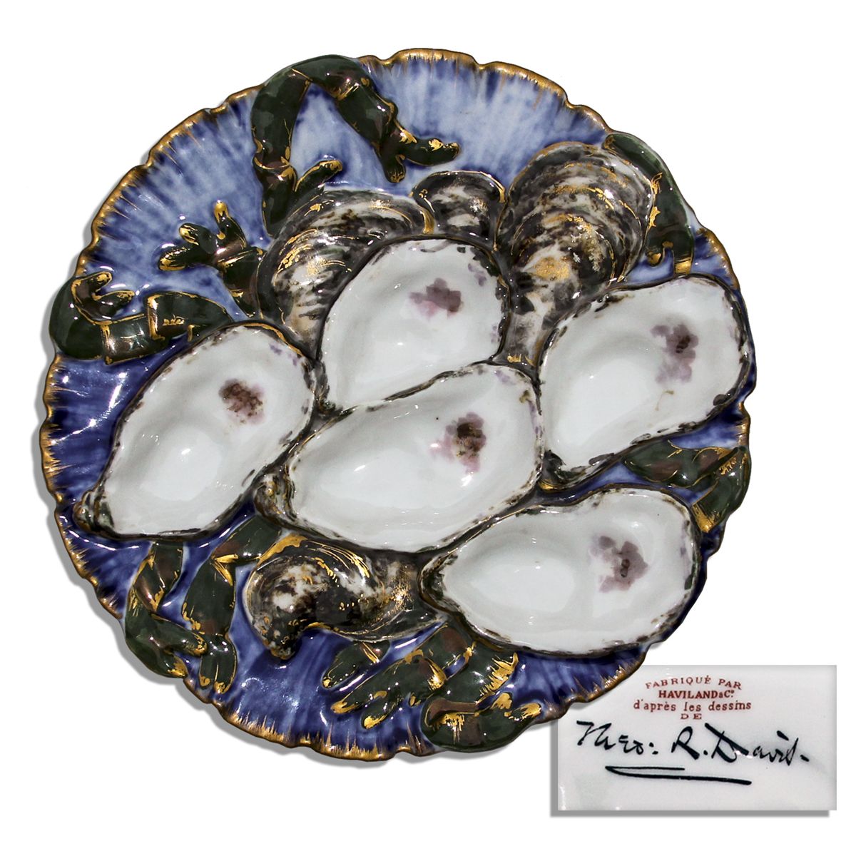 White House used oyster plate in the distinctive Rutherford B. Hayes design, a supplemental piece reordered by both the administrations of Chester Arthur and Grover Cleveland. Oyster plate features five wells in the likeness of open blue point oysters, surrounded by painted shell, seaweed and water designs highlighted in gilt. Pattern by Theodore Davis stands out as a strikingly unique, high-concept scheme for china, in which scenes of native North American wildlife are painted naturalistically, even including three-dimensional elements. Executed by Haviland and Company, the Limoges porcelain firm that provided the first order. Plate edge is scalloped. Verso features Theodore Davis' printed signature, Haviland & Company's initials, the patent date as 10 August 1880 and Haviland's manufacturer's mark. Distinct from copies sold to the public by absence of patent number. Measures 8.5'' in diameter. Rubbing to gilt rim on the underside, else fine.