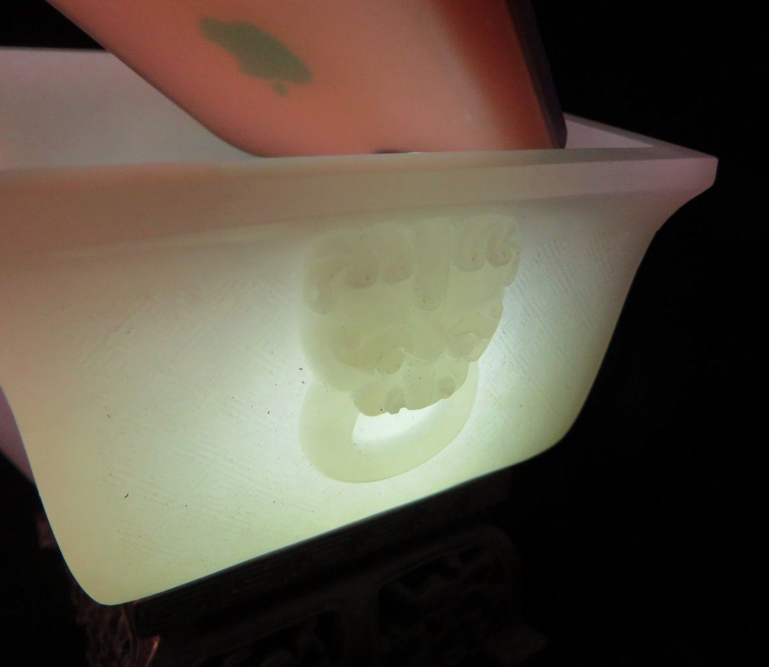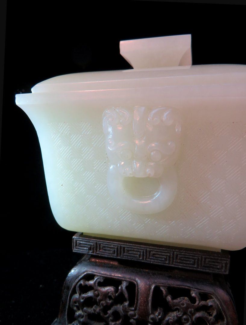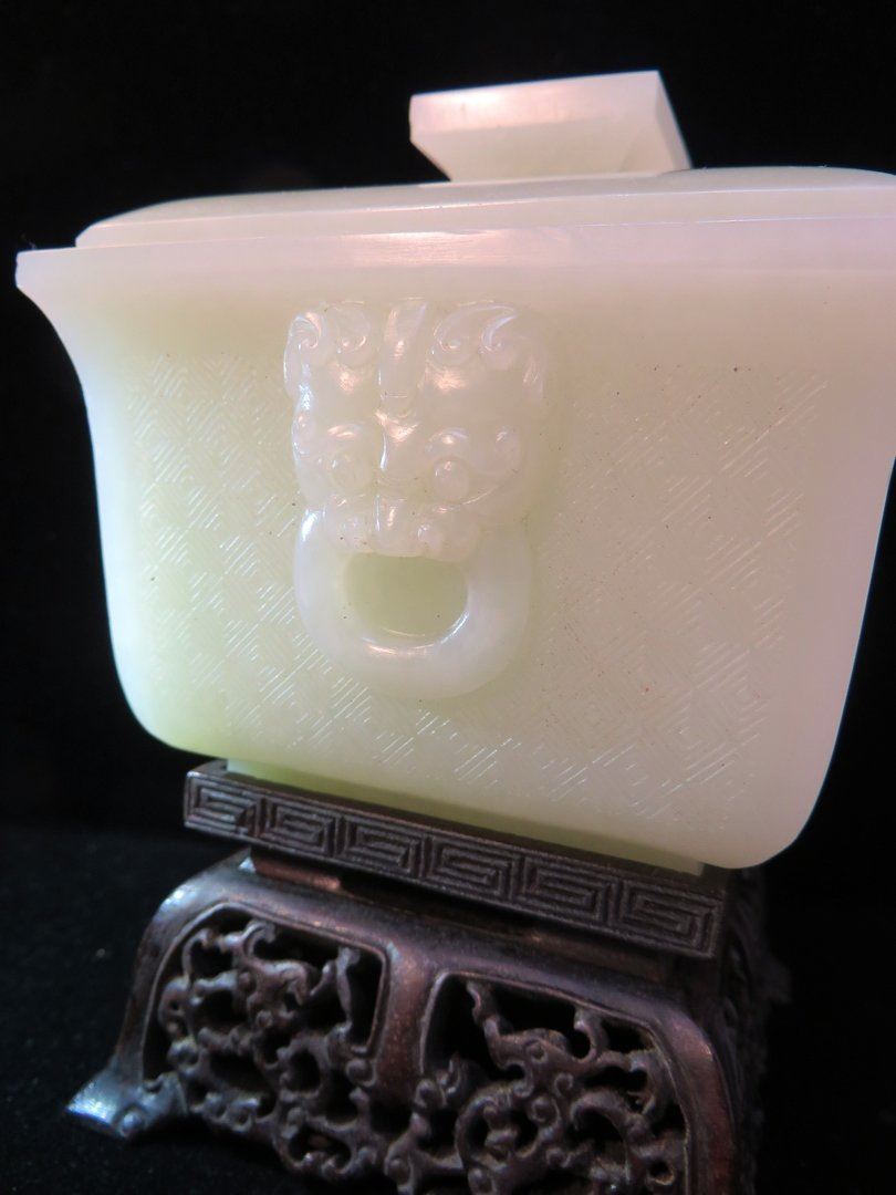 White jade lidded censer. The four sided vessel is etched in a crosshatch decoration and has lion head handles. It sits atop a carved wooden stand. R