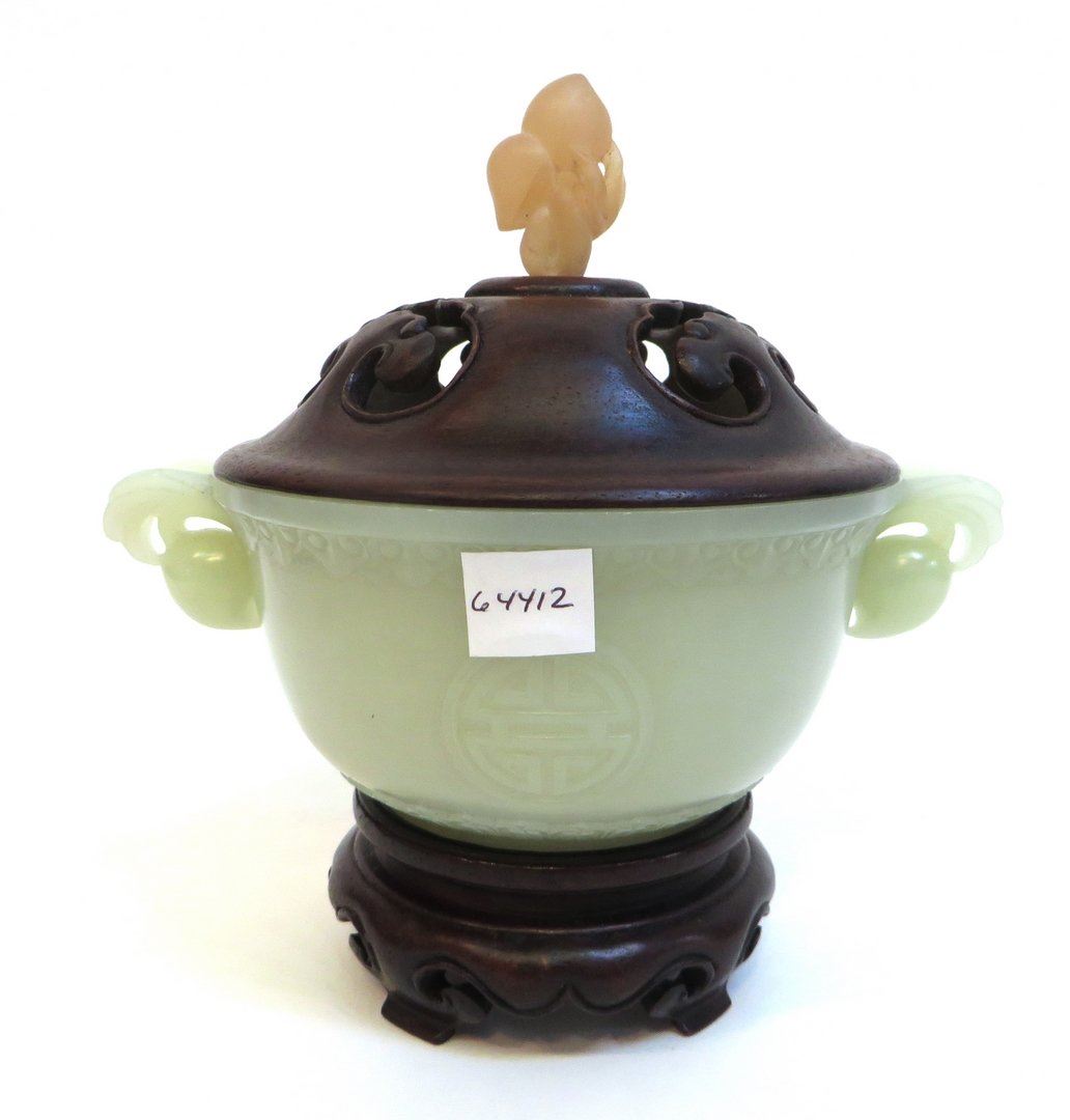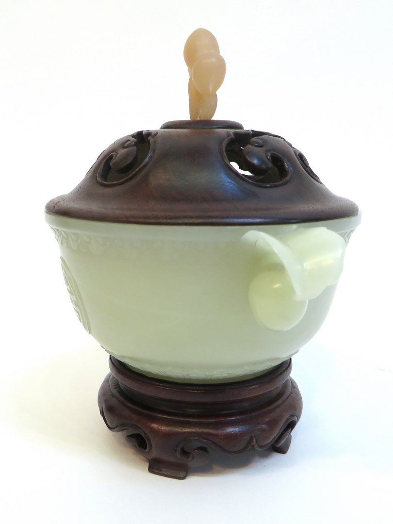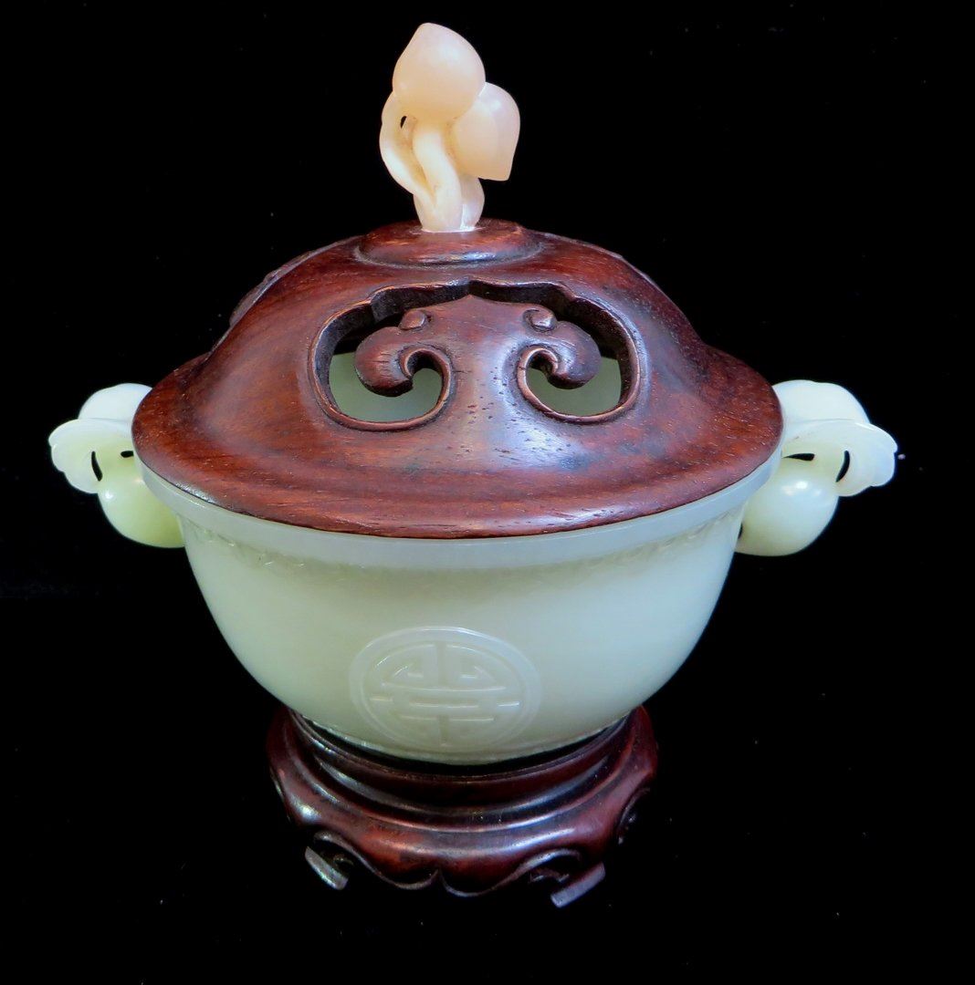 A fine white jade censer with carved rim decorations, a central character medallion, and curled leaf and "peach" shaped handles. Lotus pattern bottom border. Has both a base and wood pierced lid, the latter with a carved jade peach finial. R