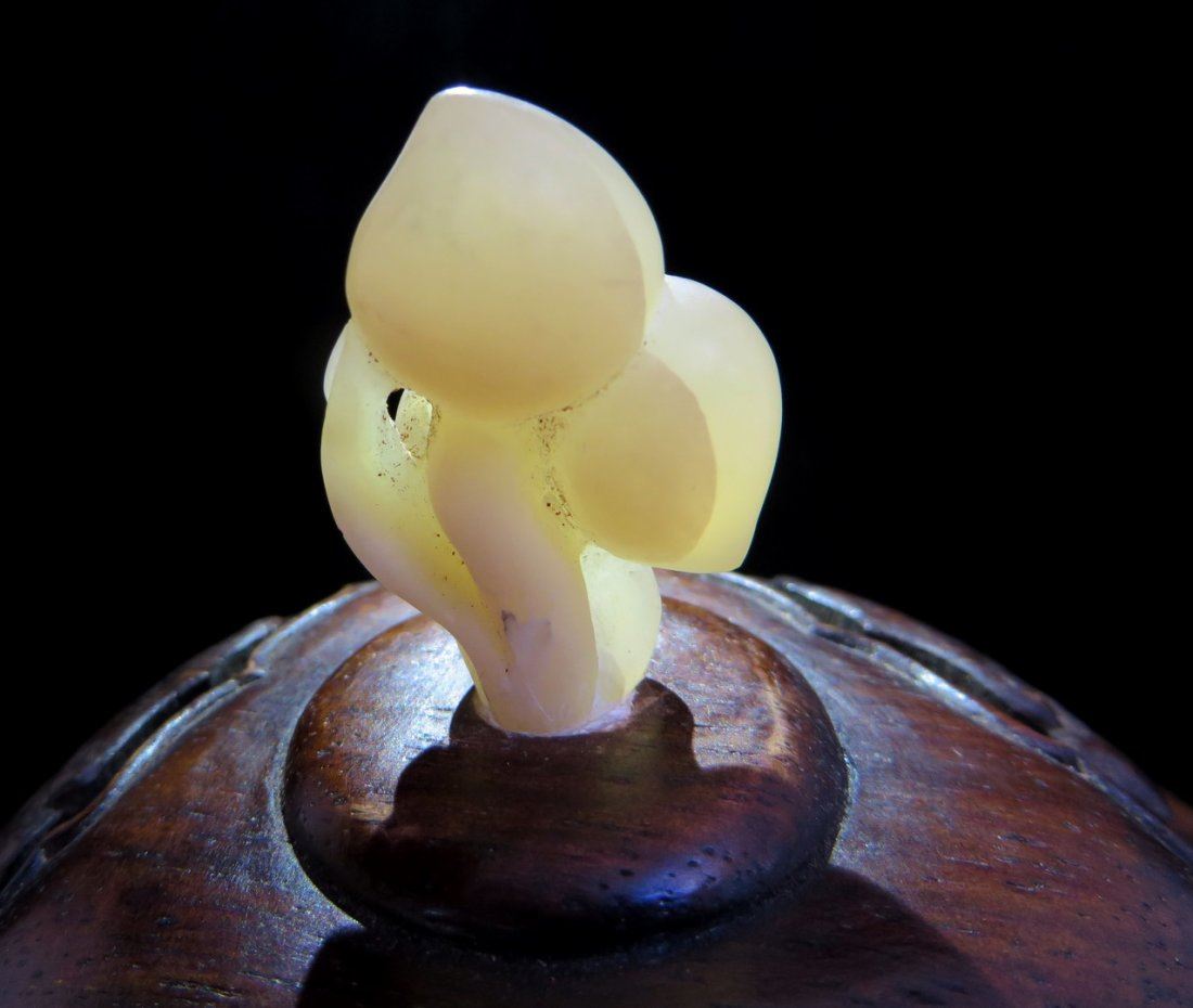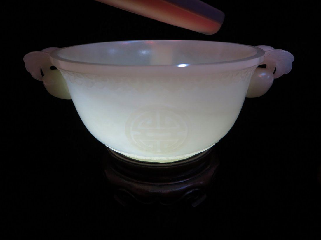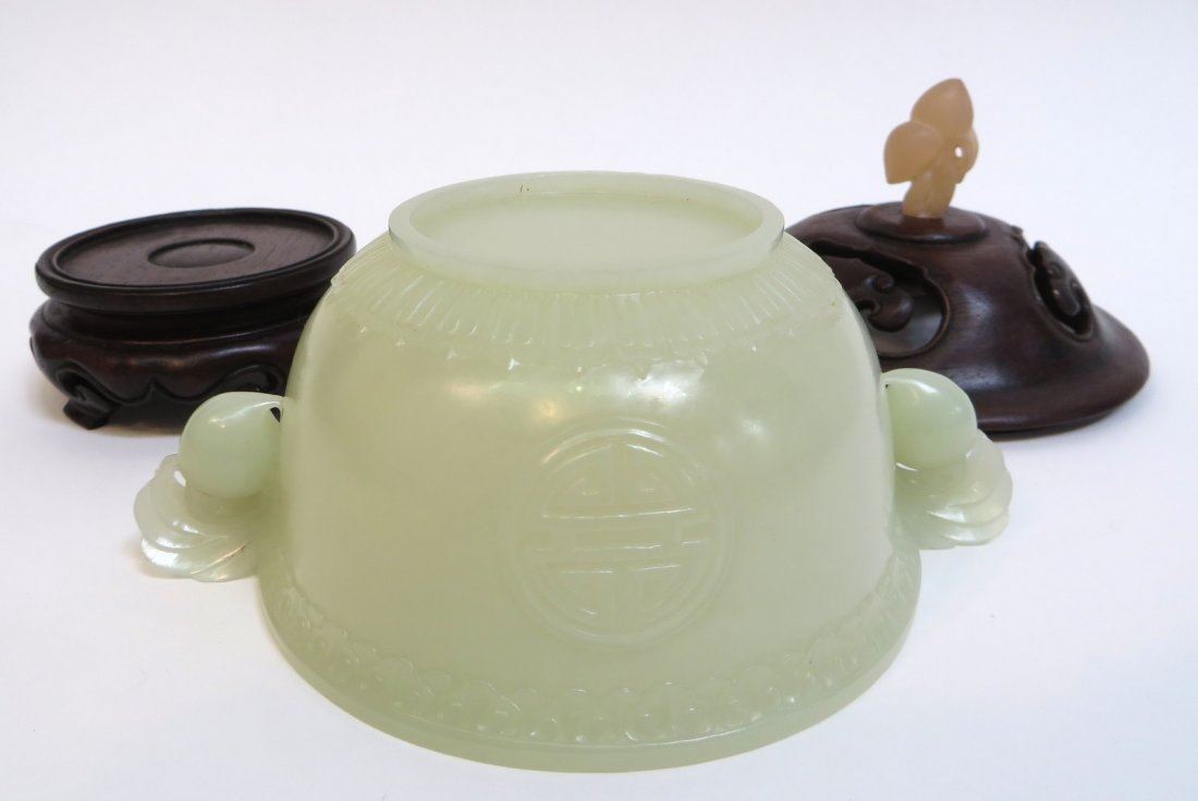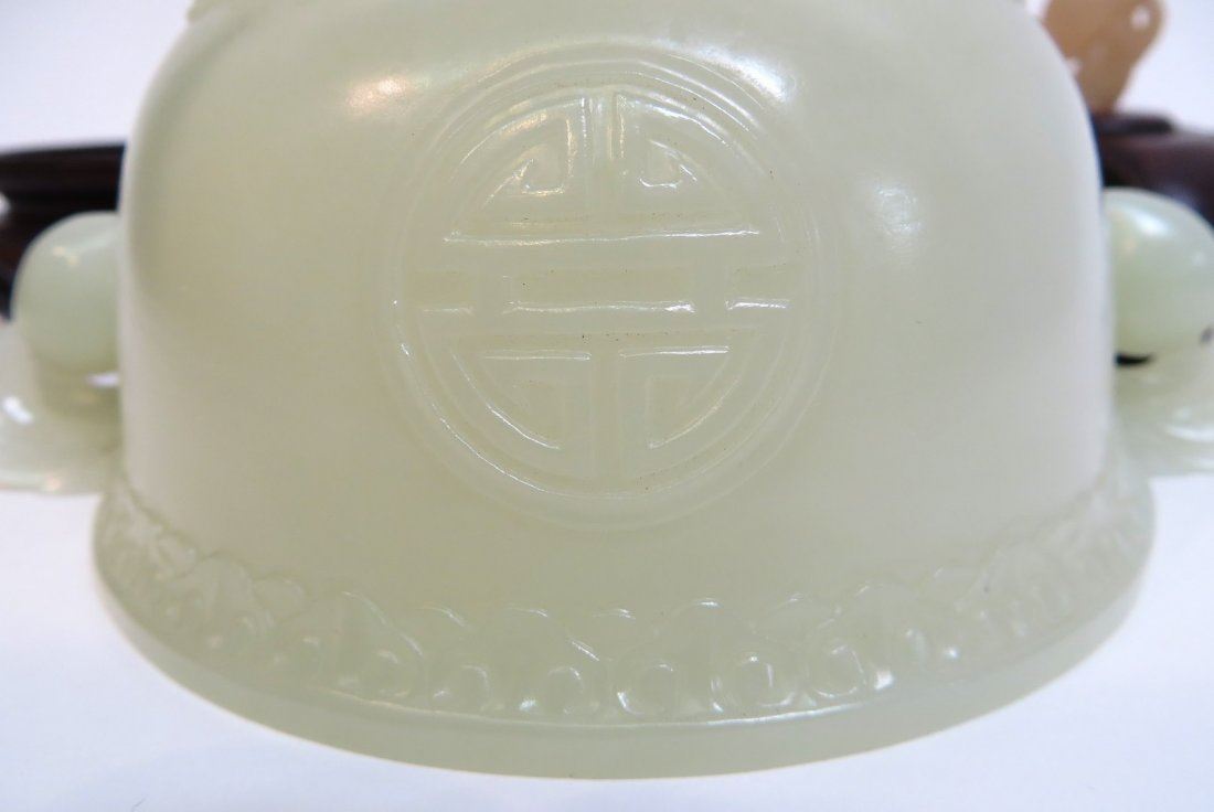 A fine white jade censer with carved rim decorations, a central character medallion, and curled leaf and "peach" shaped handles. Lotus pattern bottom border. Has both a base and wood pierced lid, the latter with a carved jade peach finial. R