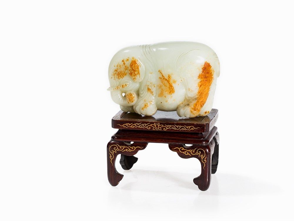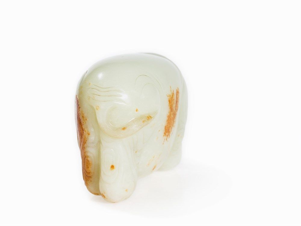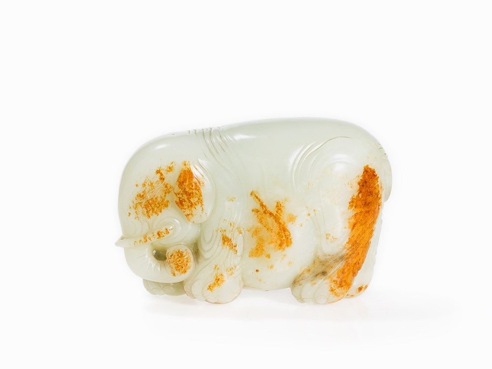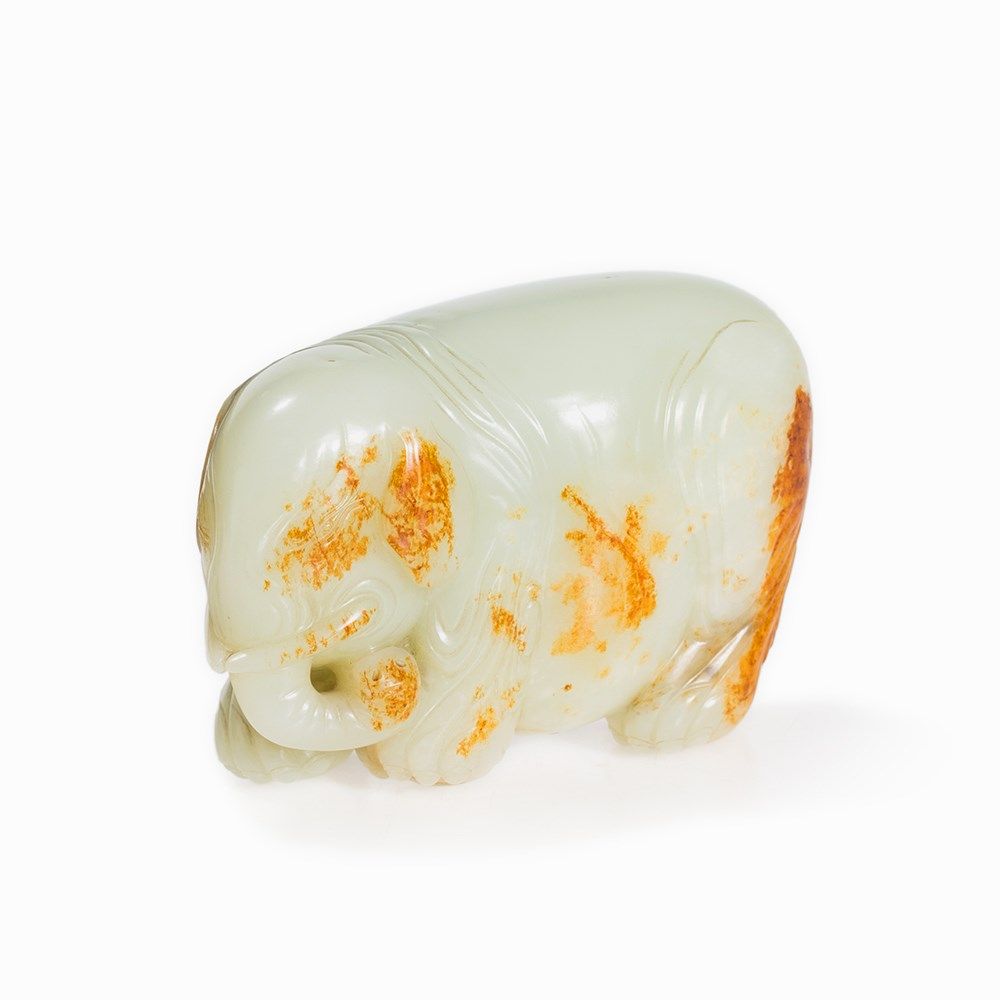 The present elephant, with its paunchy and wrinkled form, is carved after examples from the Song and Ming period. Cf. a jade carving in the shape of an elephant in the collection of the Freer Sackler Collection, Smithsonian Institution, dated to the Song Dynasty (accession no.: S1987.825). See also the figure of a festively decorated elephant made of white jade in the collection of the Palace Museum in Beijing and especially a figure of an elephant with the same color in the National Palace Museum Taipei, Taiwan.
