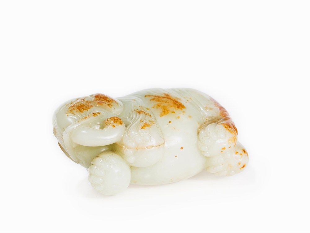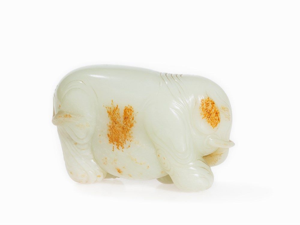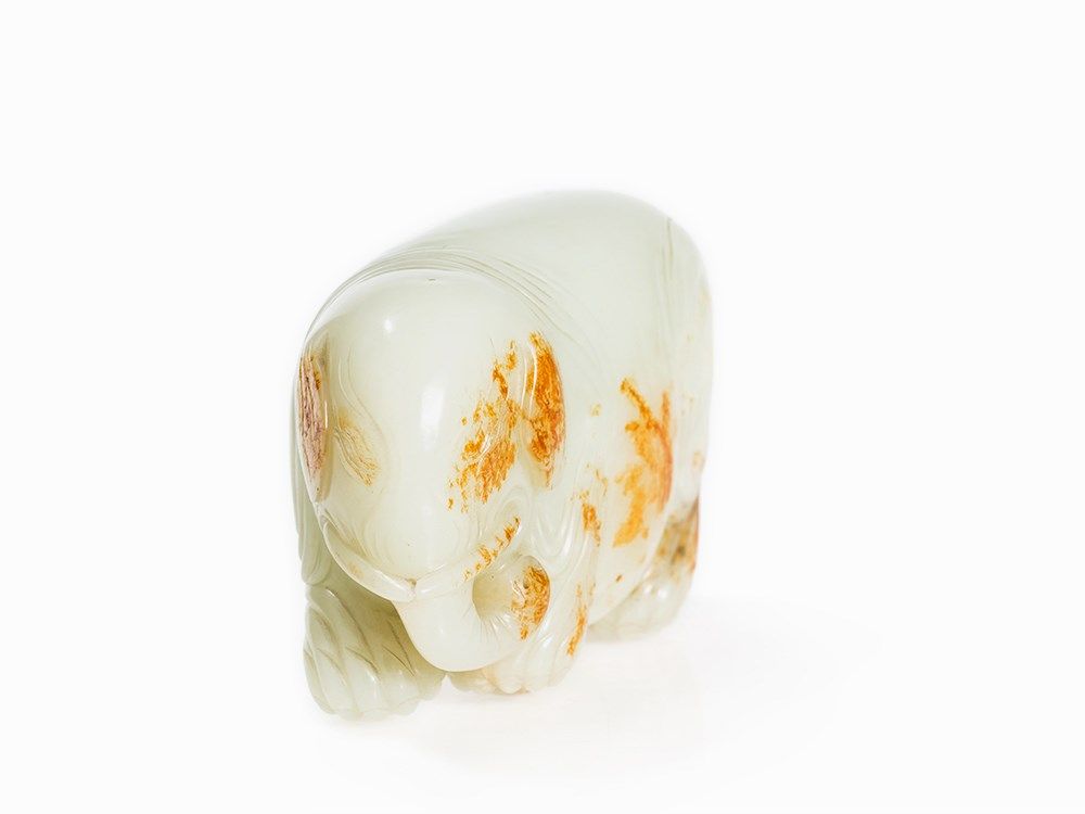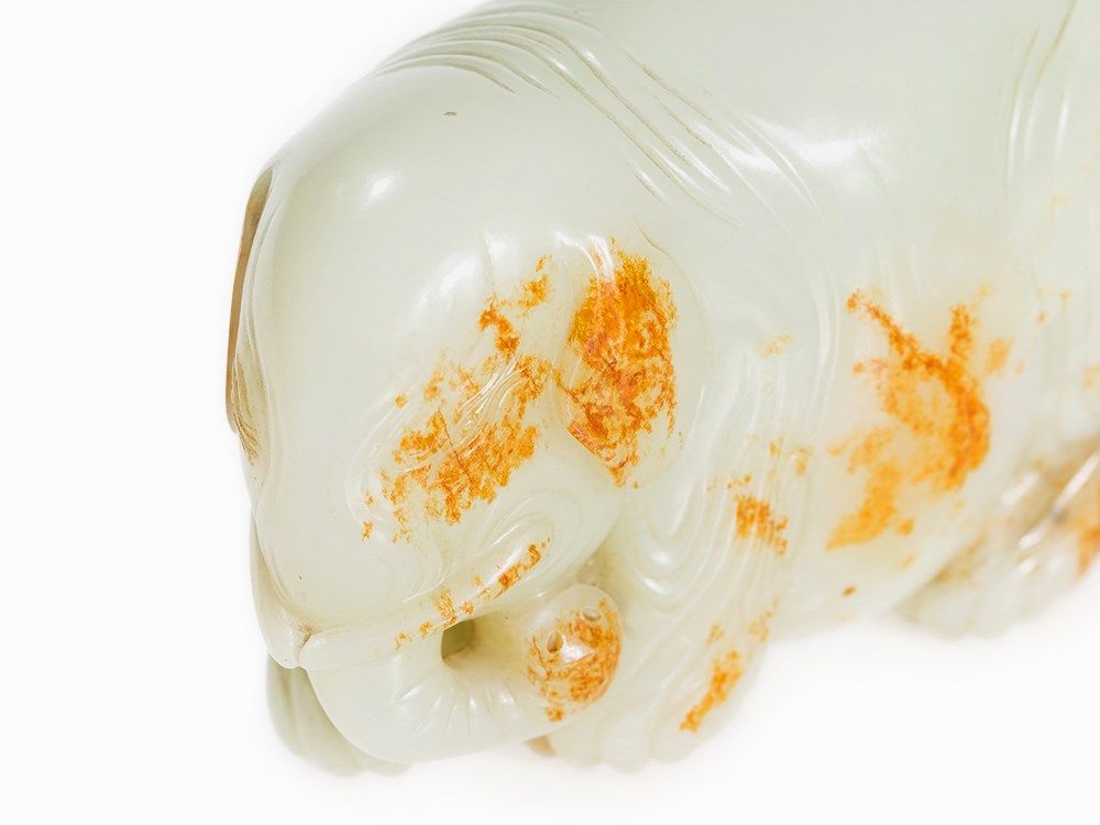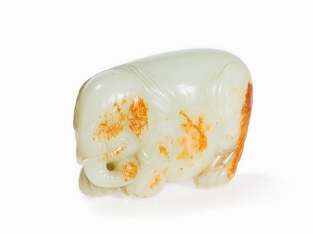 The present elephant, with its paunchy and wrinkled form, is carved after examples from the Song and Ming period. Cf. a jade carving in the shape of an elephant in the collection of the Freer Sackler Collection, Smithsonian Institution, dated to the Song Dynasty (accession no.: S1987.825). See also the figure of a festively decorated elephant made of white jade in the collection of the Palace Museum in Beijing and especially a figure of an elephant with the same color in the National Palace Museum Taipei, Taiwan.