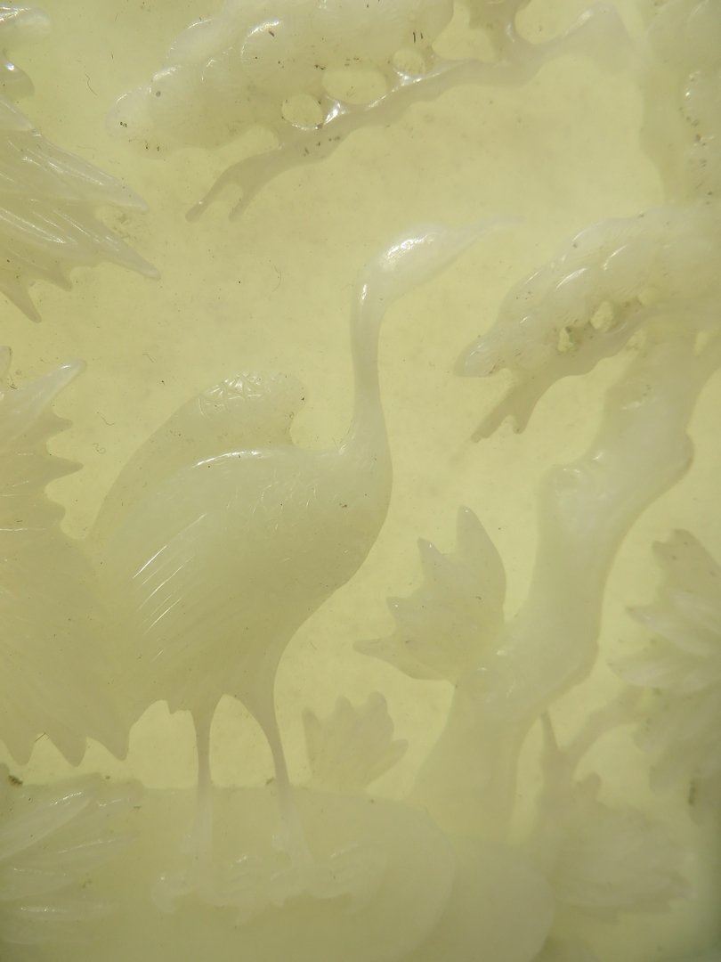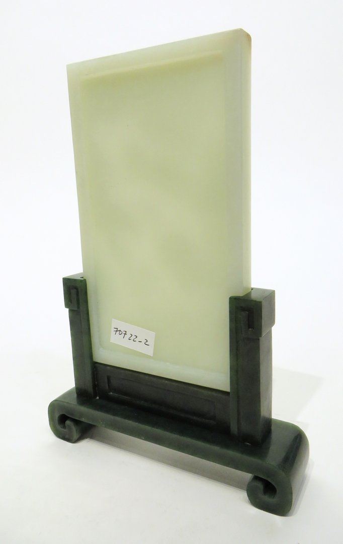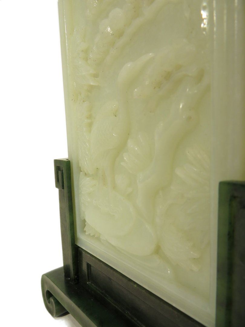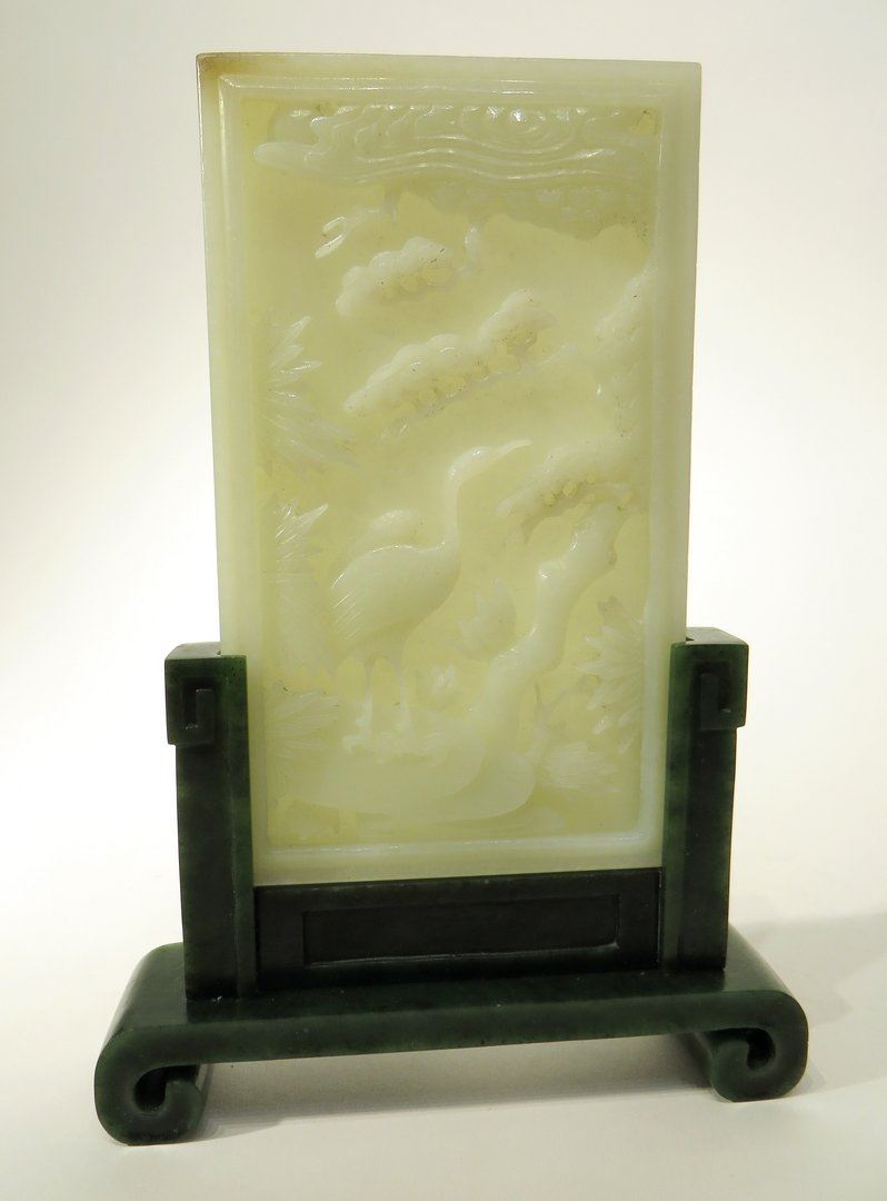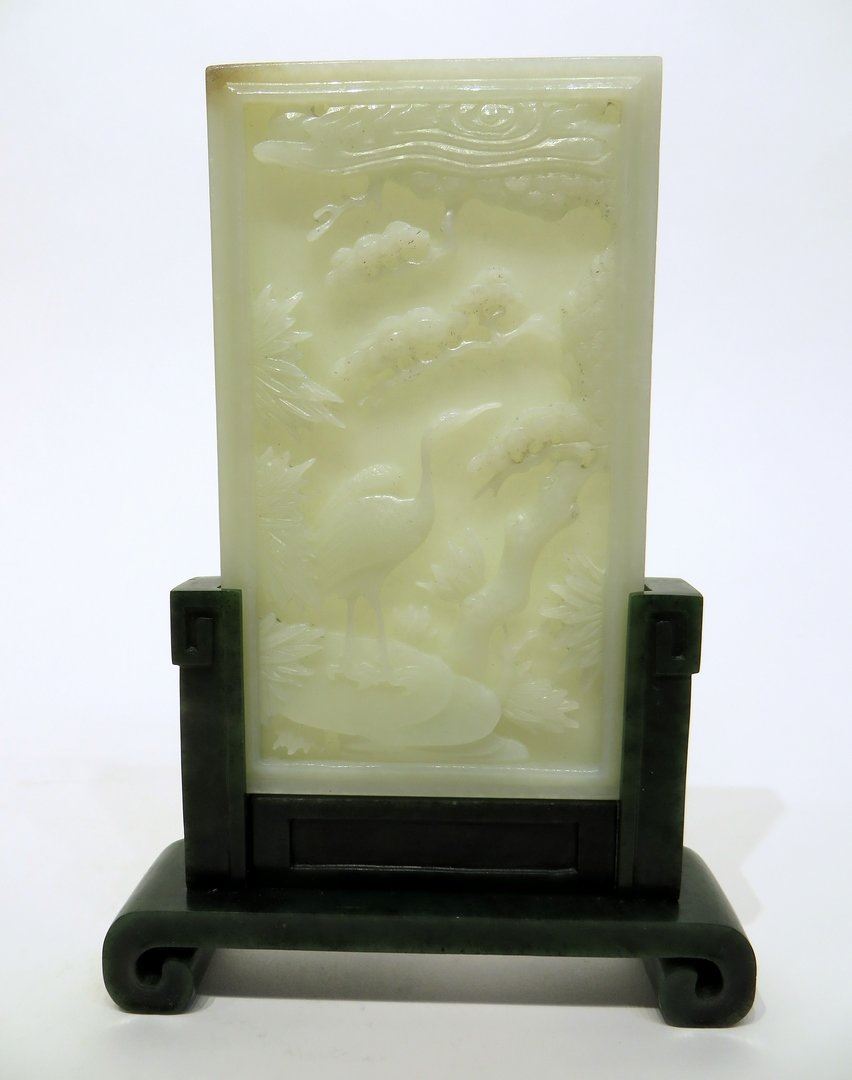 The screen is carved in a lotus and crane pattern in white jade on a slotted dark green jade base. Only 20 lots in this sale have reserves, marked with "R" at end of description.