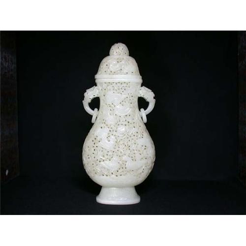 Beautiful shape and pure white tone. There haven't any visible stone viens or cracks on whole piece. Just have a little chips at the vase mouth.Fabulous carvings make it in 2 lbs weight.