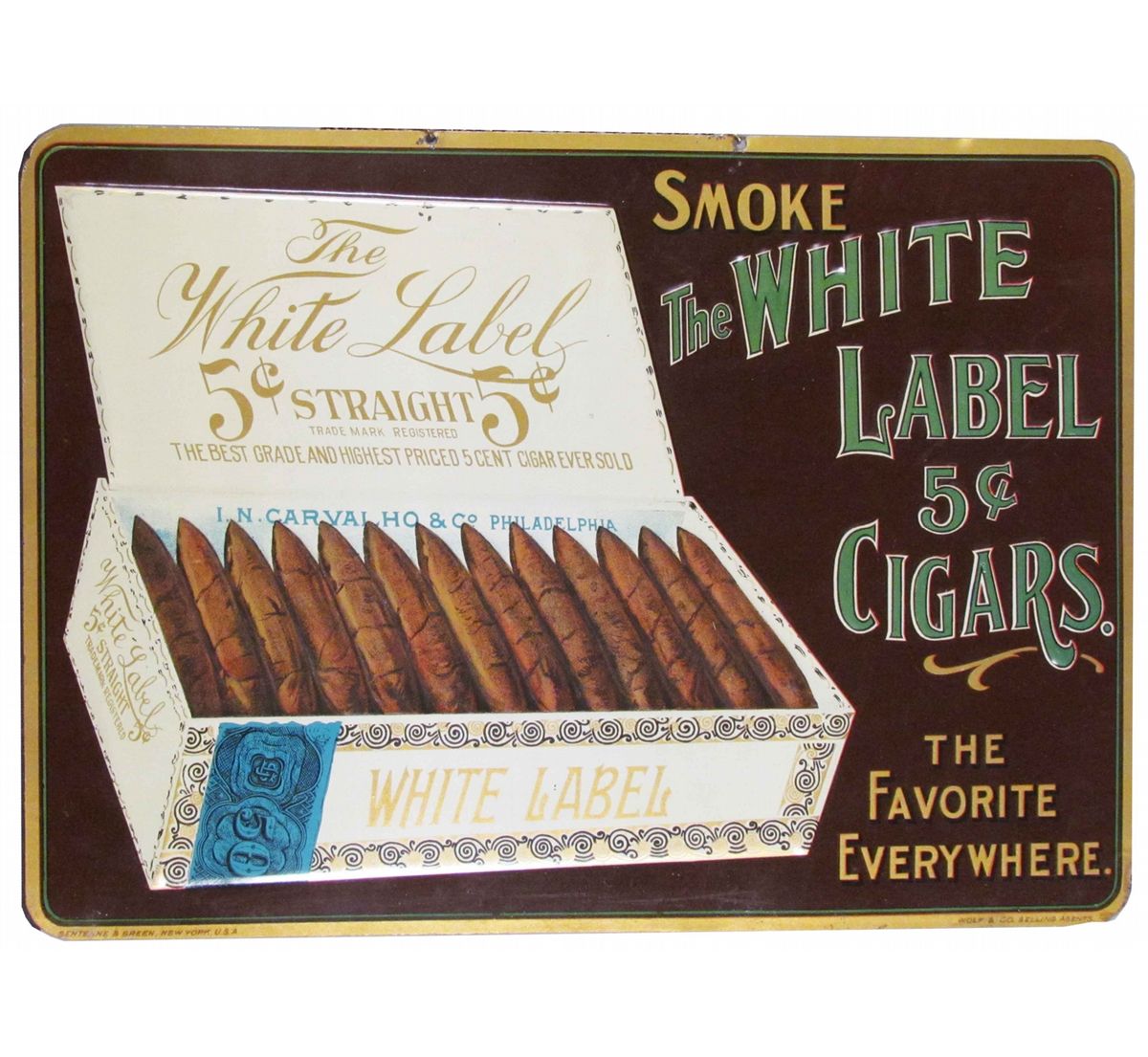 The White Label 5 Cent Cigars Self Framed Embossed Tin Chain Hanging Sign. Wolf & Co. Selling Agents. Near mint condition. 13 3/4 X 9 7/8 inches.