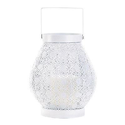 White Lace Design Candle Lamp **|**|** The intricate design of this curvy candle lantern makes a beautiful play of light and shadow when a candle is lit inside. The rounded top is accented by an intriguing square handle, and the entire piece is a work of art even when its not glowing. Item weight: 1 lb. 6-3/4 x 6-3/4" x 9-1/4" high. Iron. 1 EA"