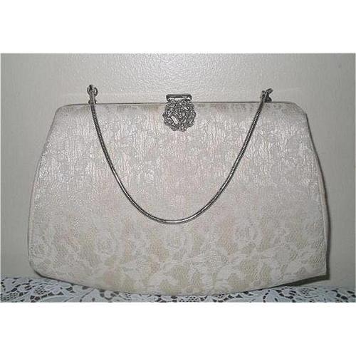 </font></strong>This is so delightfully dainty and feminine, white lace overlaid on creamy ivory color satin and a floral design silver tone snap closure. This purse is in perfect next to mint condition, inside and out and ready to take you in style to a summer wedding or any formal event. The silver tone snake carry handle is fully retractable and will sit discreetly inside the purse if you wish to use as a clutch purse, the carry handle has a height of 4-1/2" inches from the top of the purse. The measurements of the purse are 8-1/2" inches wide by 5-1/2" inches tall and the depth is 3/4" of an inch. The lining inside is in dark navy blue grosgrain fabric and flawless condition. Fabulous! </font>