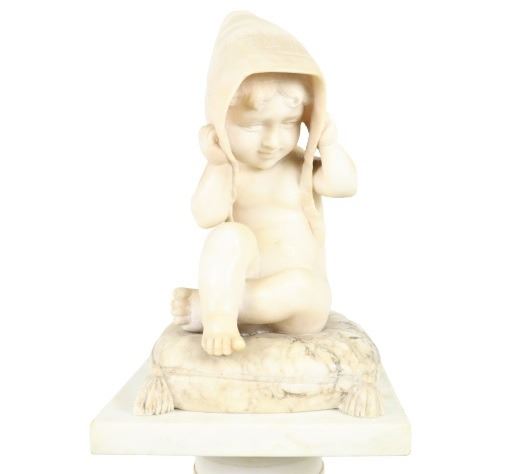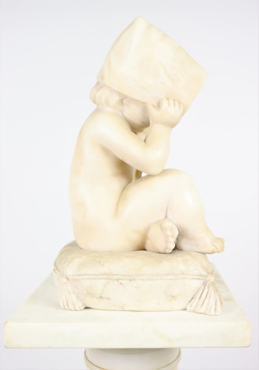 Charming European marble sculpture of an young child wearing a bonnet and seated on a cushion. Well executed, appears to be unsigned. Sculpture in excellent condition. Marble Pedestal not included.