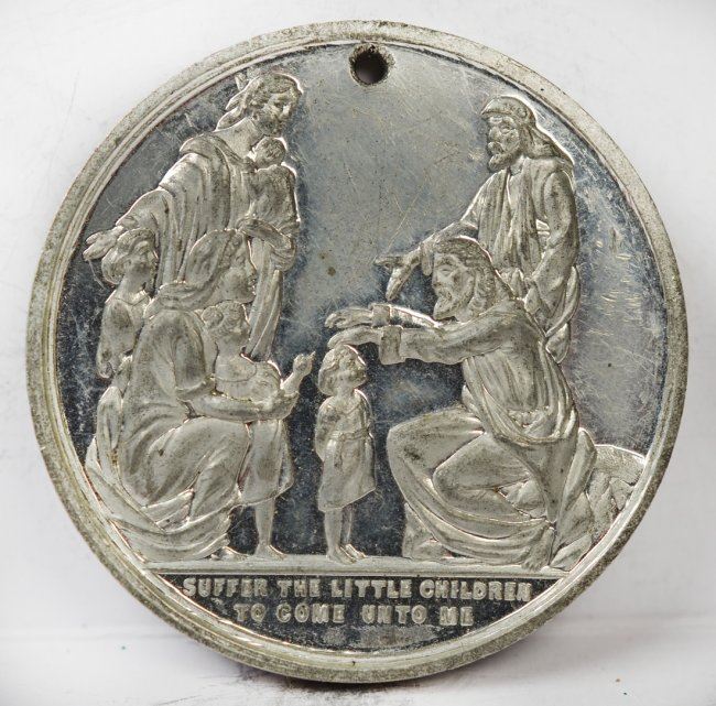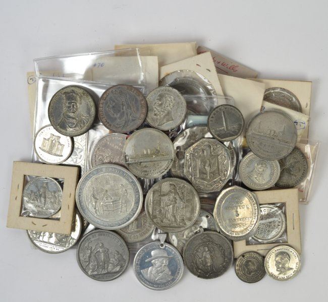 Large assortment of various white metal and aluminum medals from primarily 19th and 20th century, but a few earlier. Average size, 35mm - 40mm, with a few larger size medals. Assortment of topics including 1892 Worlds Columbian Expo. Approximately 44 pieces.